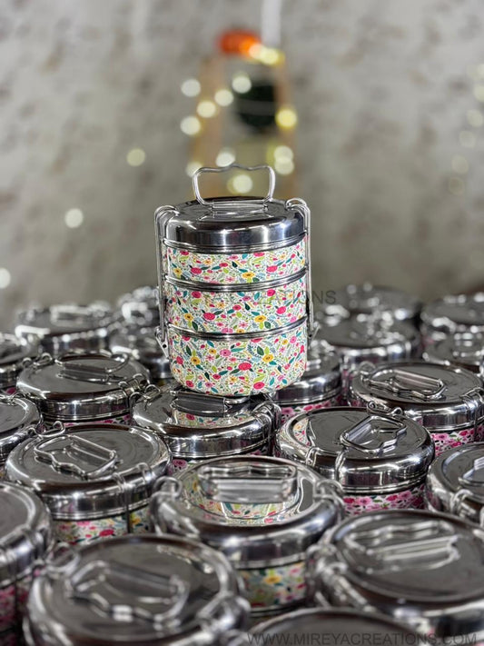 3-Tier Stainless Steel Printed Tiffin Carrier Return Gift | Lunch Box Gift Under ₹1200 | Wedding & Housewarming Favor