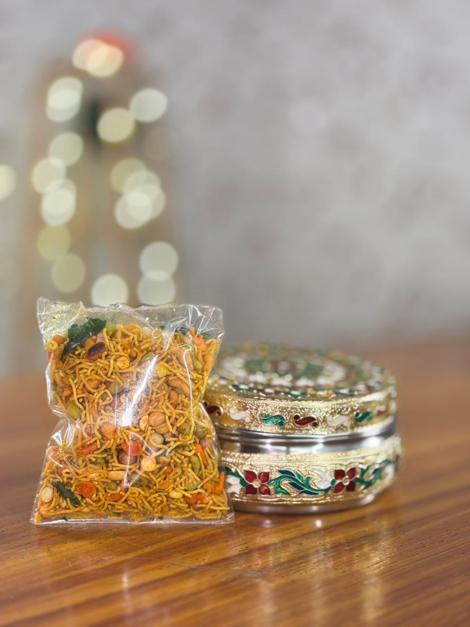 Serve tradition with a tasty twist using Mireya Creations’ Meenakari Round Snack Box with Mixture a vibrant return gift that combines elegant keepsake packaging with everyone’s favourite namkeen. The sturdy round metal box is decorated with intricate Meenakari style floral borders, then wrapped in a bright net cover for a festive finish. Inside, a hygienically packed portion of crunchy Indian mixture/namkeen makes this gift instantly ready to distribute at weddings, housewarmings, baby showers, or Diwali parties.