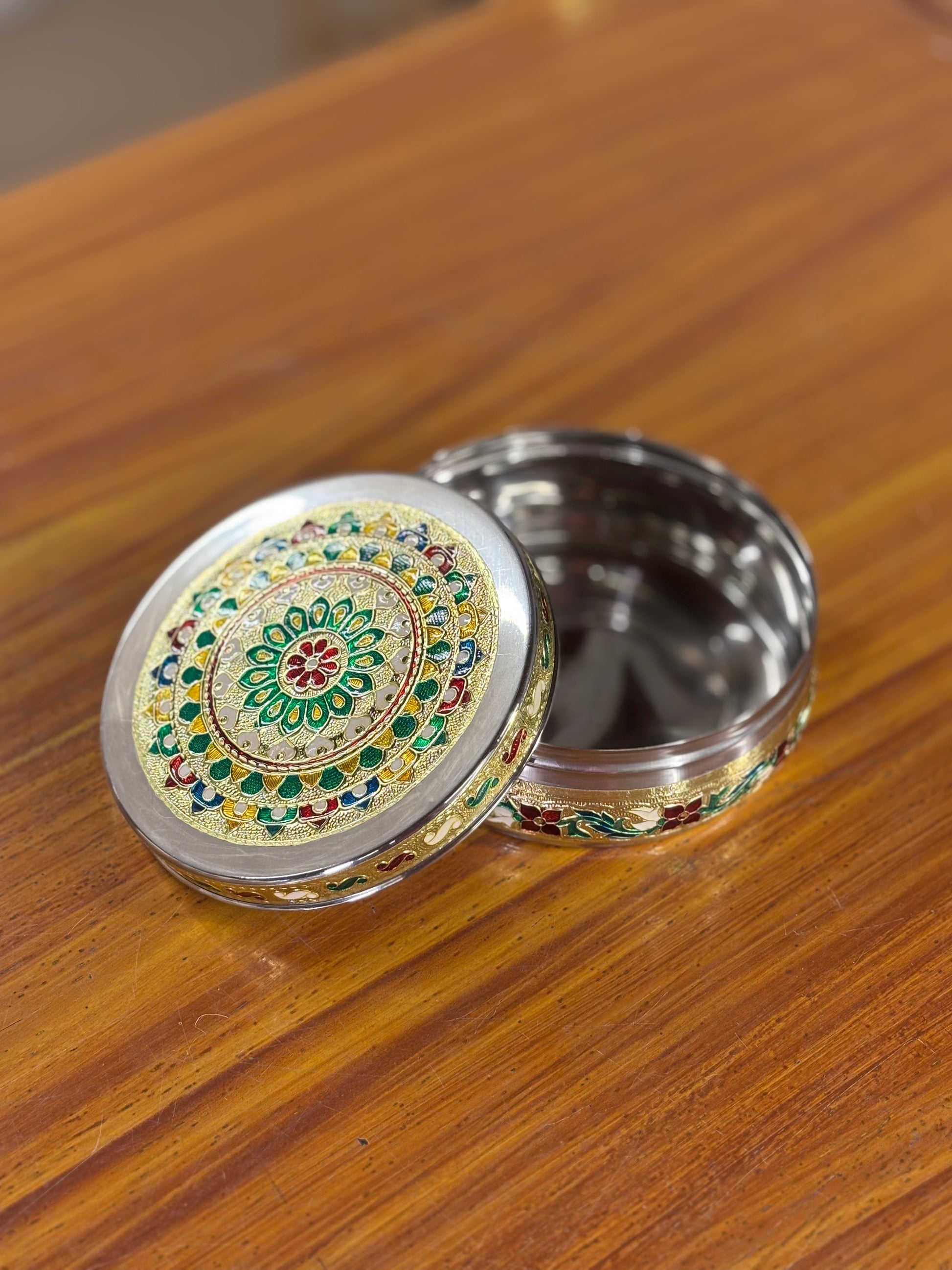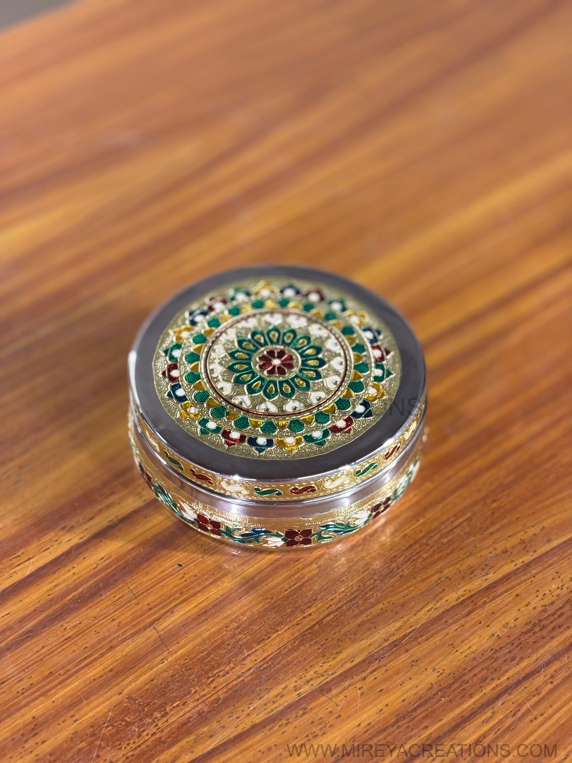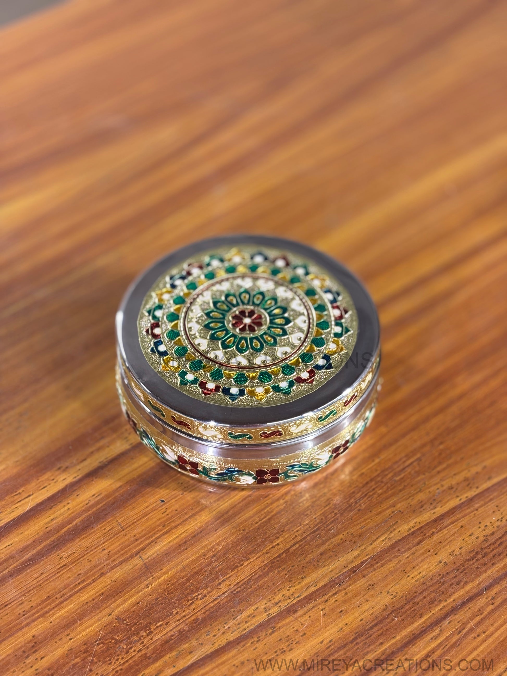 One handcrafted round 6inch metal box featuring detailed Meenakari art and a floral motif