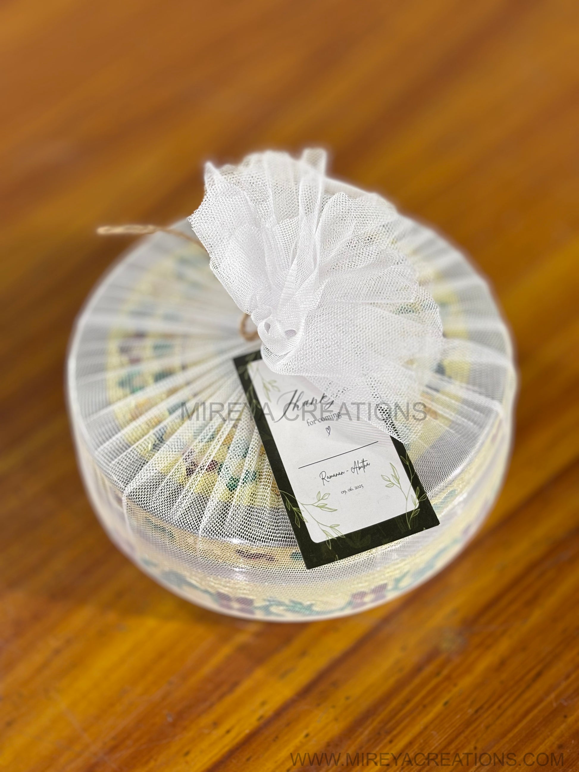 Dazzle your guests with this Meenakari Round Metal Box by Mireya Creations a grand return gift that celebrates Indian heritage and fine craftsmanship. The sturdy metal box is adorned with a radiant floral Meenakari design in vibrant hues, combining utility with elegance for festive gifting. It opens to reveal ample space for gifting dry fruits, sweets, jewelry, or treasured keepsakes and comes beautifully finished with a sheer net pouch and customizable occasion tag. For hosts seeking a memorable, traditional, and visually impressive favor, this Meenakari box is ideal for weddings, housewarmings, engagements, and milestone events.