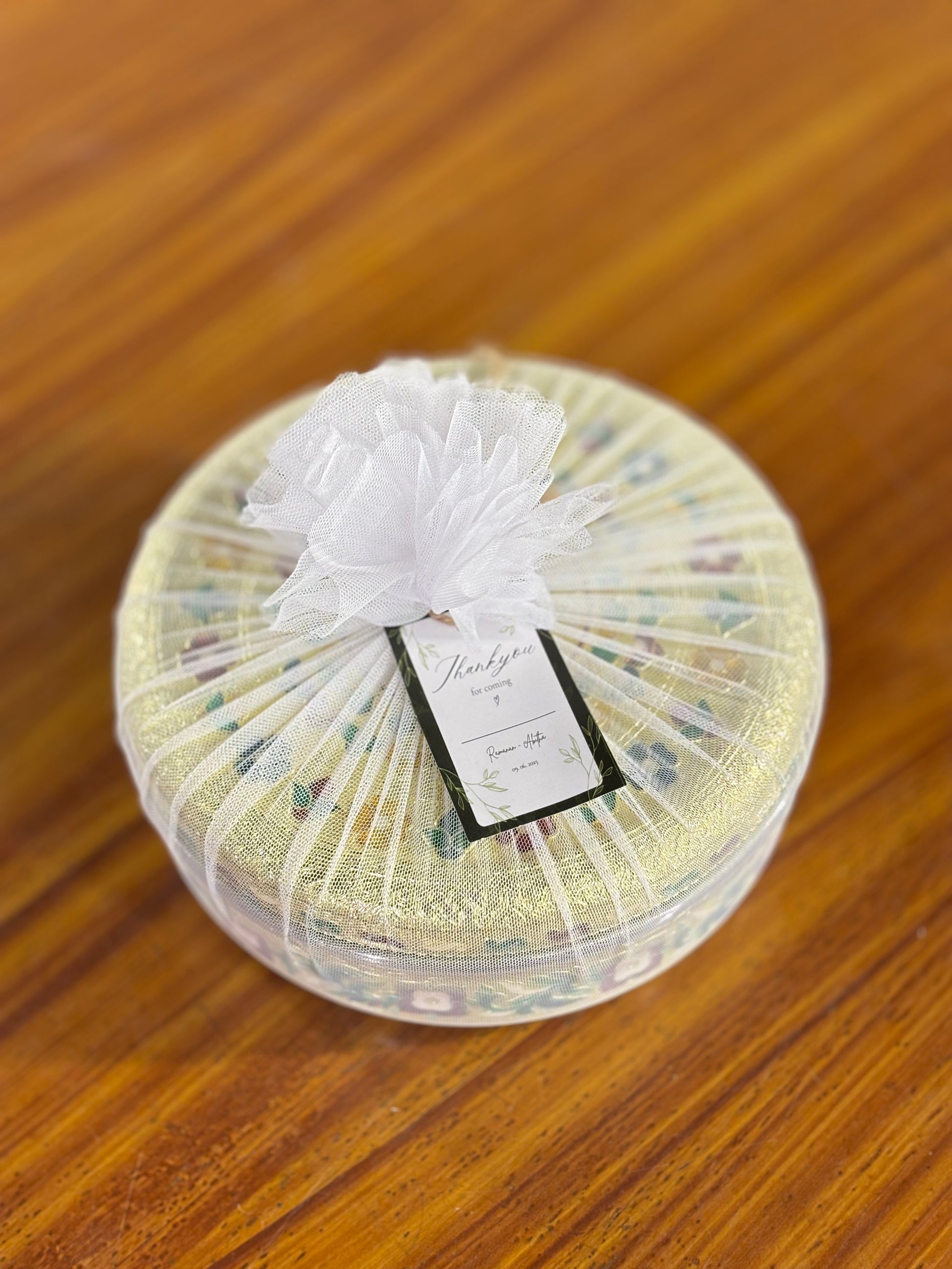 Gift a piece of royalty with Mireya Creations’ Meenakari Metal Round Box a dazzling return gift that merges traditional Indian artistry with modern elegance. Handcrafted from durable metal and adorned with multi colored Meenakari floral designs and detailed embossing, this keepsake box brings grandeur to any occasion. Finished with a secure lid and presented in a shimmering net pouch with event tag, it’s ideal for weddings, housewarmings, baby showers, or festive parties. Fill it with sweets, dry fruits, jewelry, or small treasures to make your gifting unforgettable.