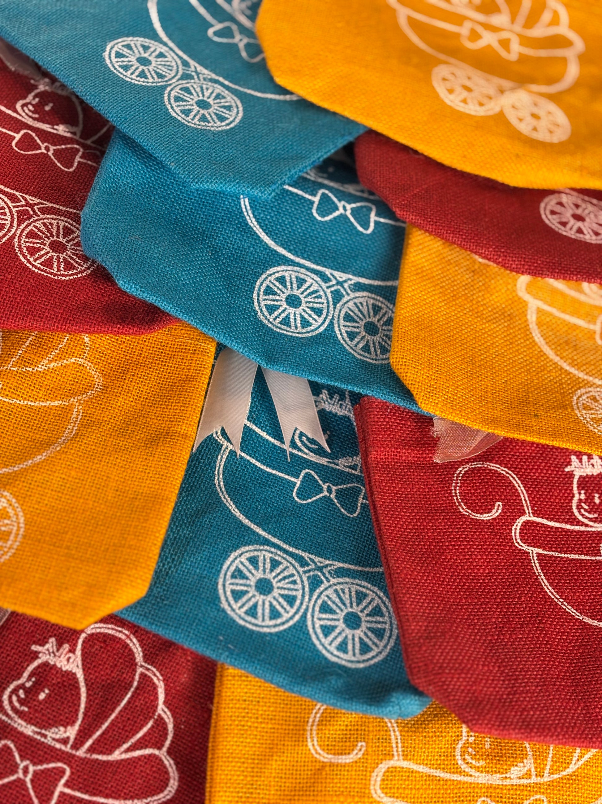 Baby pram printed jute bag with rope handles and bow, assorted colours
