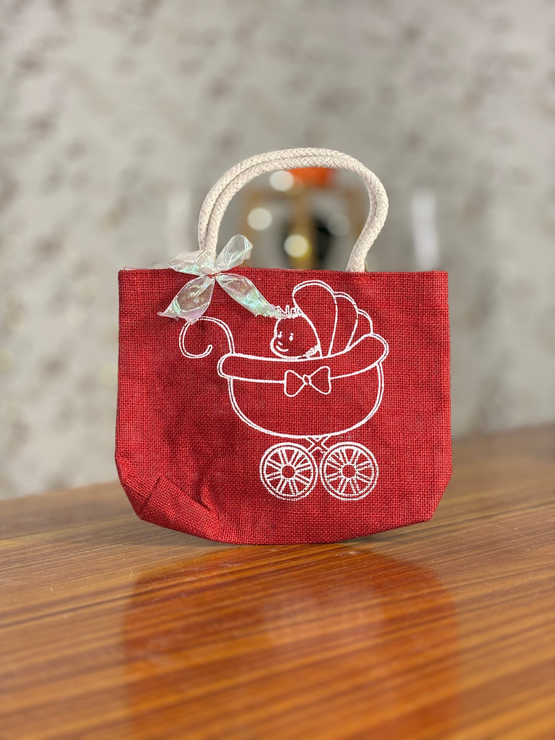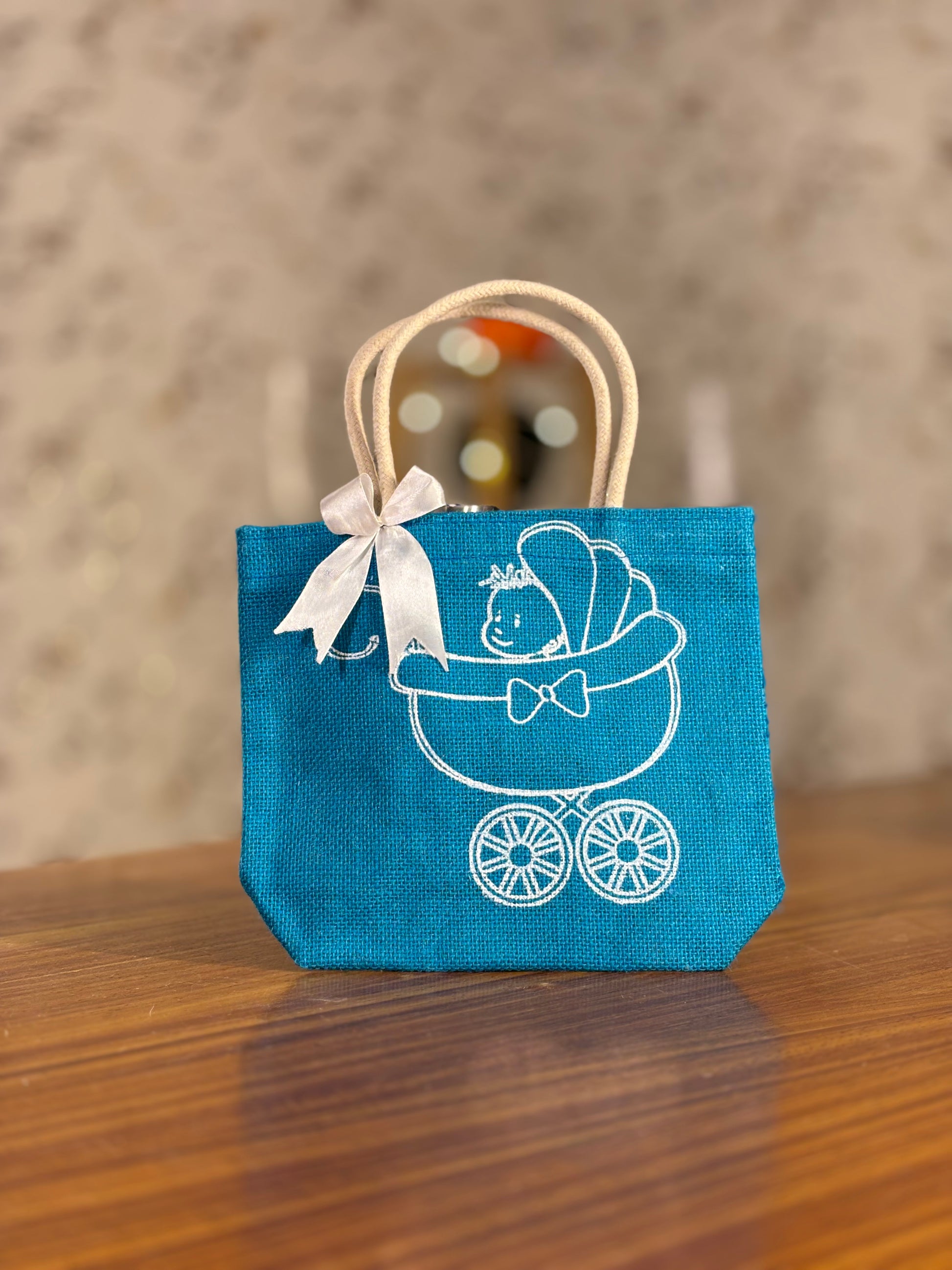Celebrate your little one in style with Mireya Creations’ Baby Pram Printed Jute Bags adorable, eco‑friendly return gift bags designed specially for baby showers, naming ceremonies, and cradle ceremonies. Each mini tote features a cute baby in pram outline print, soft rope handles, and a satin bow accent, available in bright assorted colours like mustard yellow, teal blue, and maroon. These sturdy lamininated jute bags are perfect for packing candles, dry fruits, chocolates, toys, or mini hampers, giving guests a reusable keepsake they can carry long after the celebration.