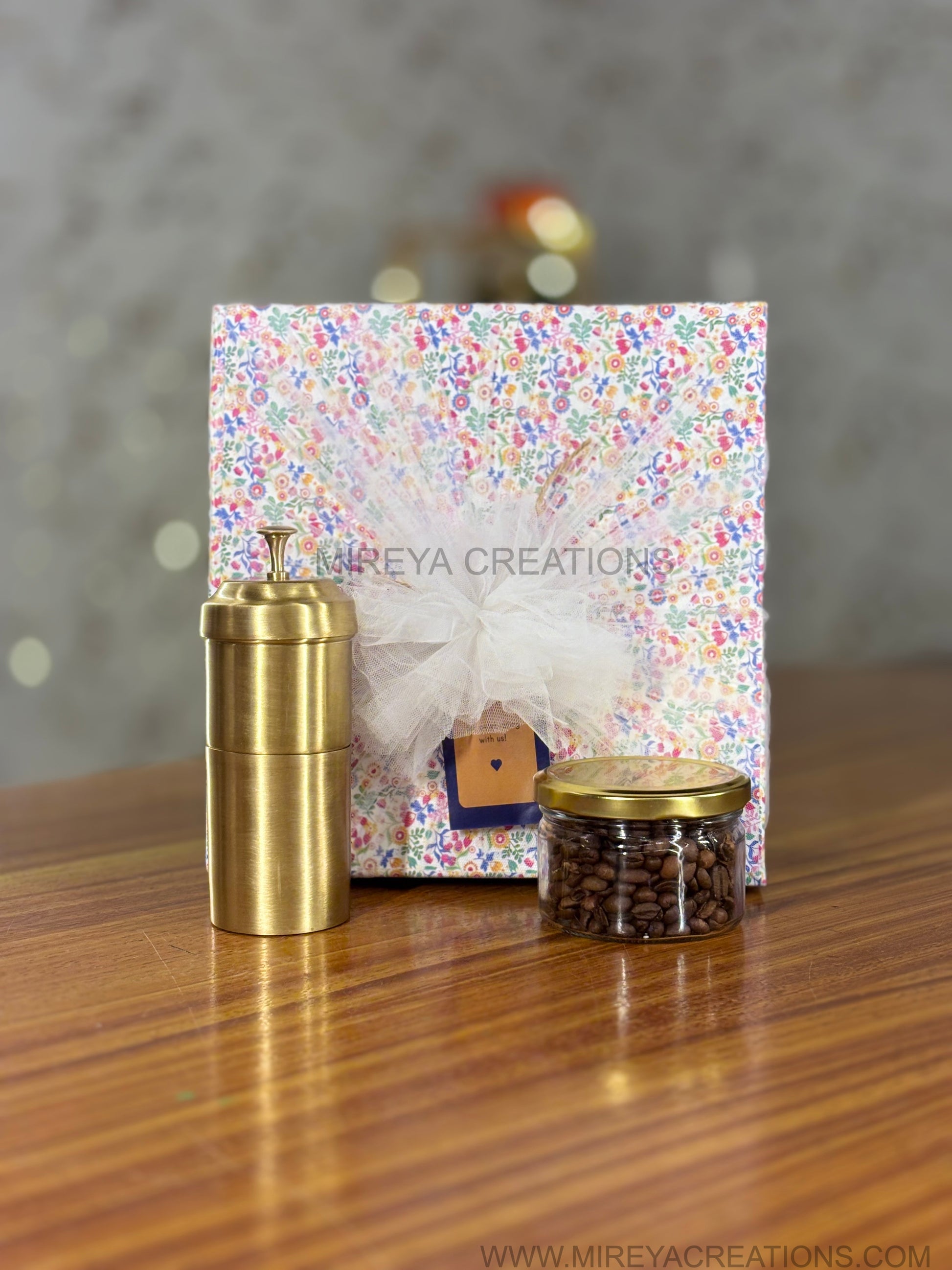 Curated for true coffee enthusiasts, this Mireya Creations hamper pairs a minimalist brass hand grinder with a jar of whole roasted coffee beans so recipients can enjoy the aroma of freshly ground coffee every morning. The grinder’s cylindrical brass body adds a warm, luxurious touch to any coffee corner, while the reusable glass jar with metal lid keeps beans fresher for longer and looks elegant on open shelves. A colourful floral printed box, finished with soft white net and a personalised message tag, makes the entire set gift ready for weddings, anniversaries, corporate events or festive gifting.