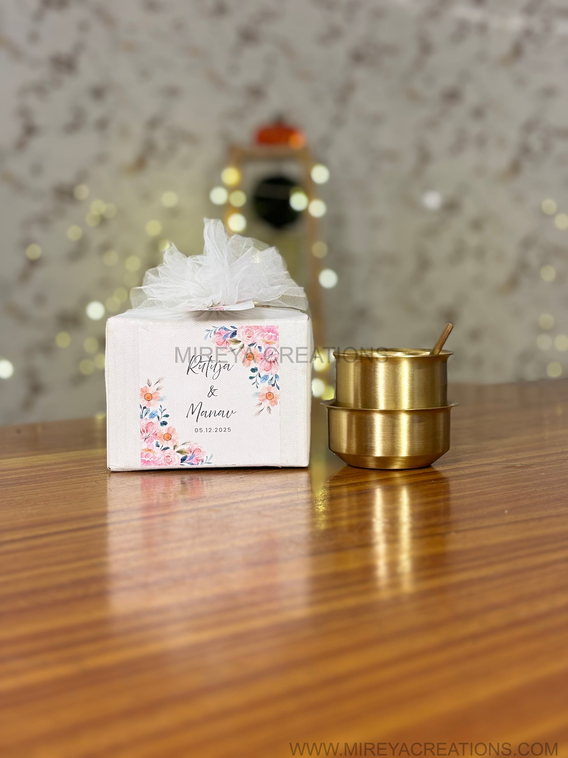Create a true filter coffee experience for your guests with this mini brass dabara set from Mireya Creations. The set includes a traditional brass tumbler and shallow dabara bowl in a brushed golden finish, designed for cooling and aerating South Indian filter coffee in the classic back and forth pouring style. Packed in a sturdy rigid box printed with the couple’s names, wedding date and pastel floral artwork, and topped with an elegant white net bow, it looks premium on any return gift table.
