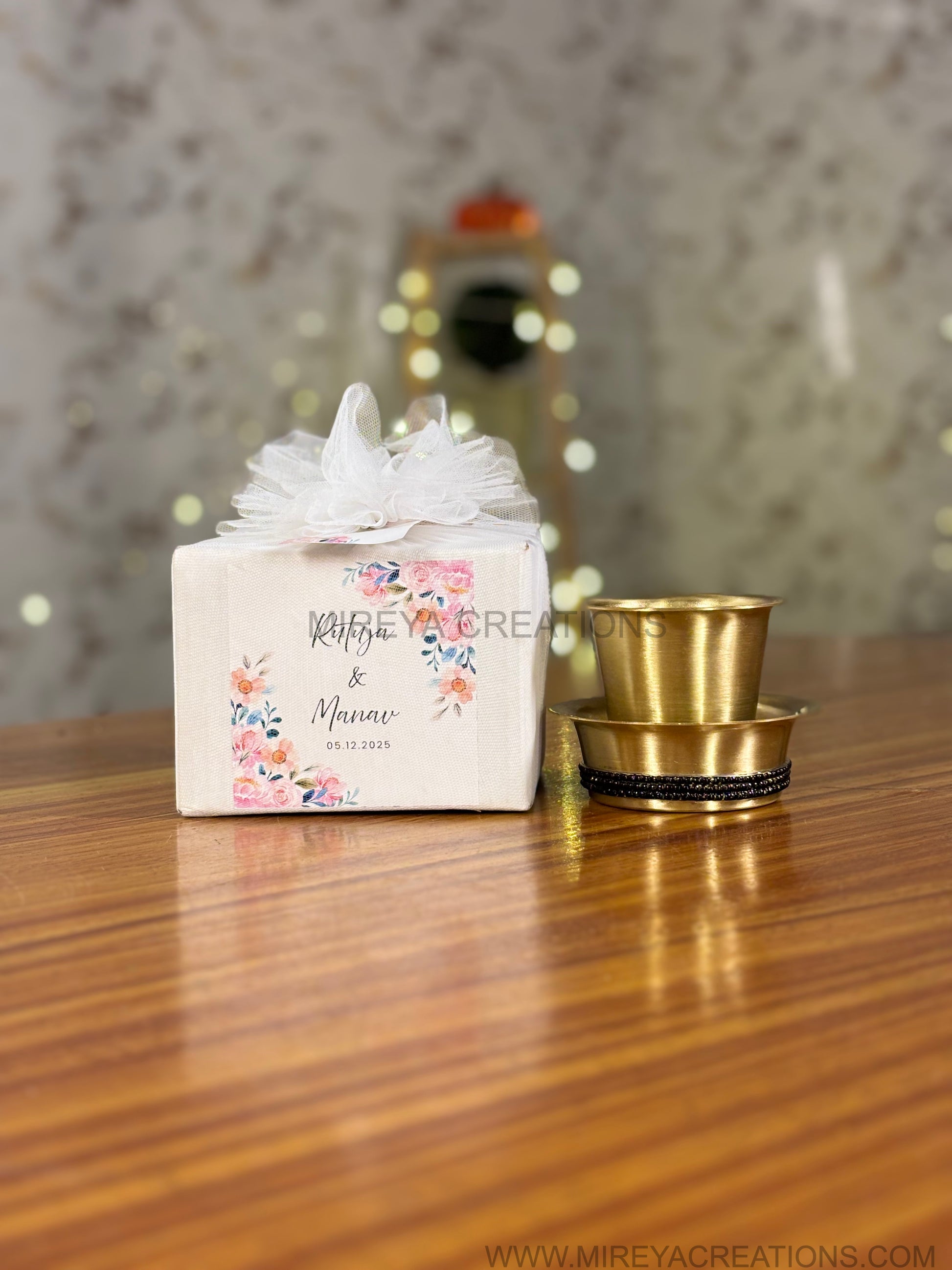 Serve filter coffee in style with this premium brass dabara set from Mireya Creations. The set includes a traditional tapered tumbler and wide davara bowl in brushed brass, with the bowl finished with a chic black beaded ring that adds a modern touch to the classic South Indian design. Packed in a rigid floral gift box printed with the couple’s names and wedding date and topped with a white net bow, it is an instantly presentable, zero hassle wedding or muhurtham return gift.
