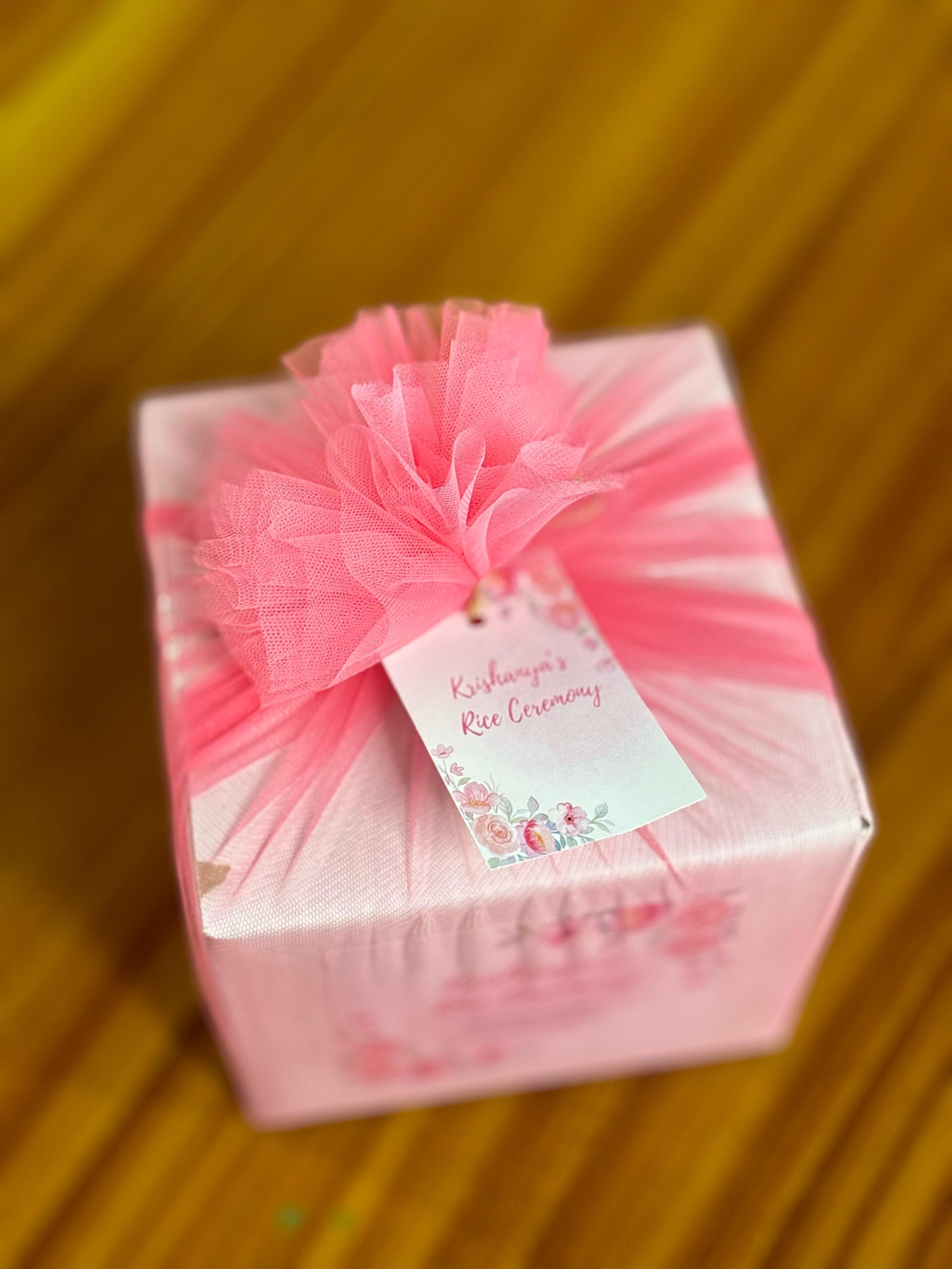 Custom Printed Gift Box beautifully wrapped in pink net fabric