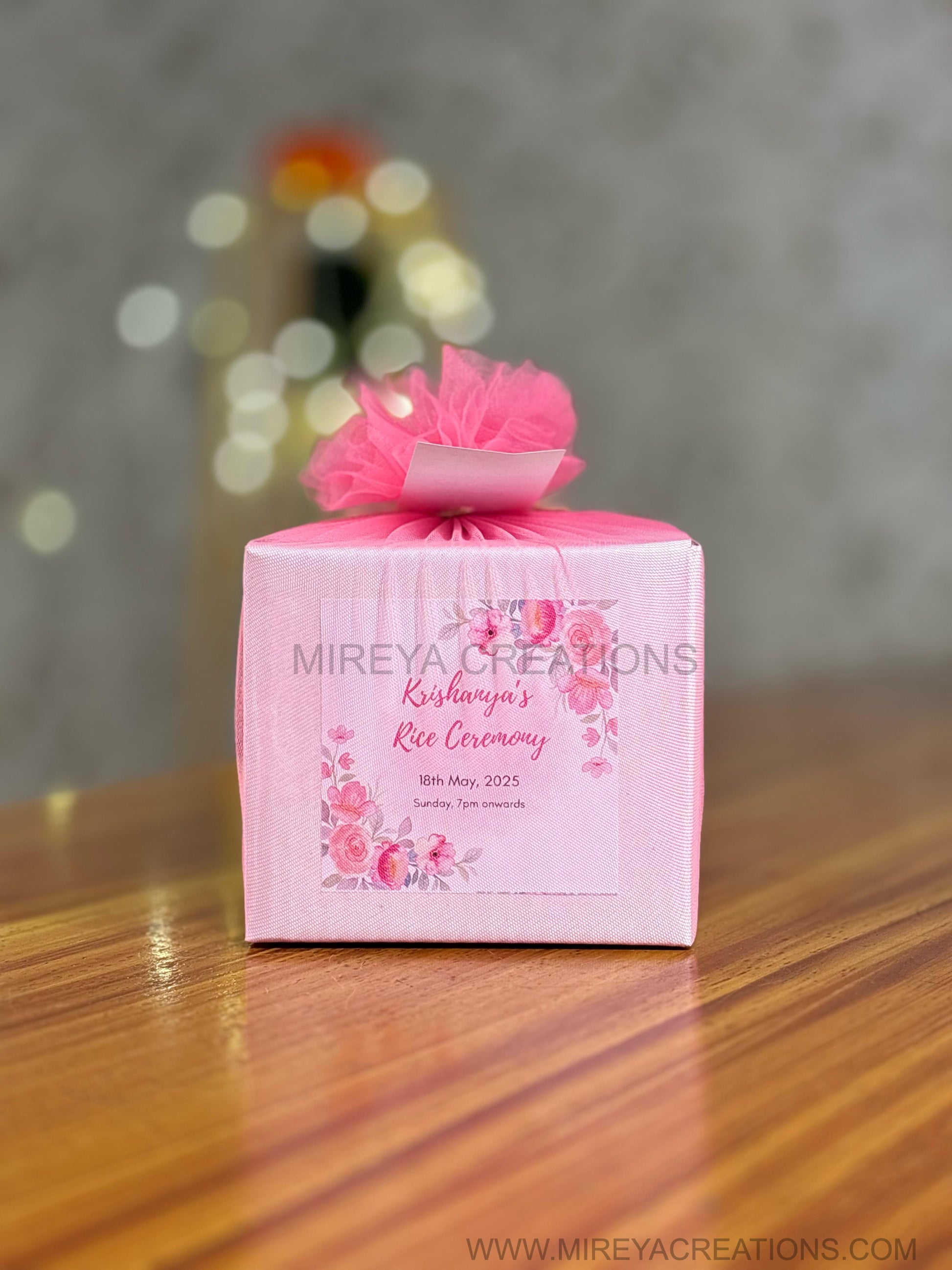 - pink keepsake box wrapped in net with customised event label.