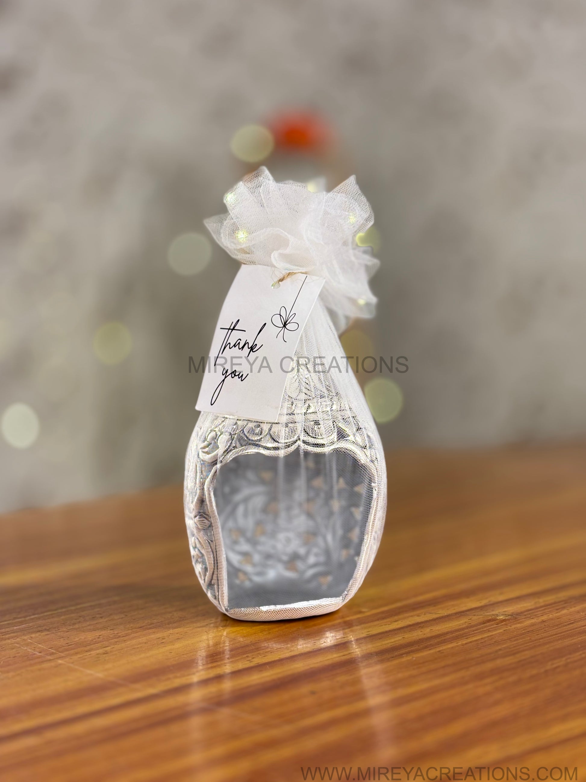 This german antique silver T‑light candle holder from Mireya Creations is crafted with intricate floral embossing and a vintage look that makes any corner feel special. Designed to hold a single T‑light or small votive, it casts beautiful patterned shadows when lit, creating a warm, inviting glow for pooja rooms, centre tables or festive decor. Each holder is wrapped in sheer white net and finished with a “Thank you” tag, so it’s completely ready to present as an elegant return gift without any extra packing.