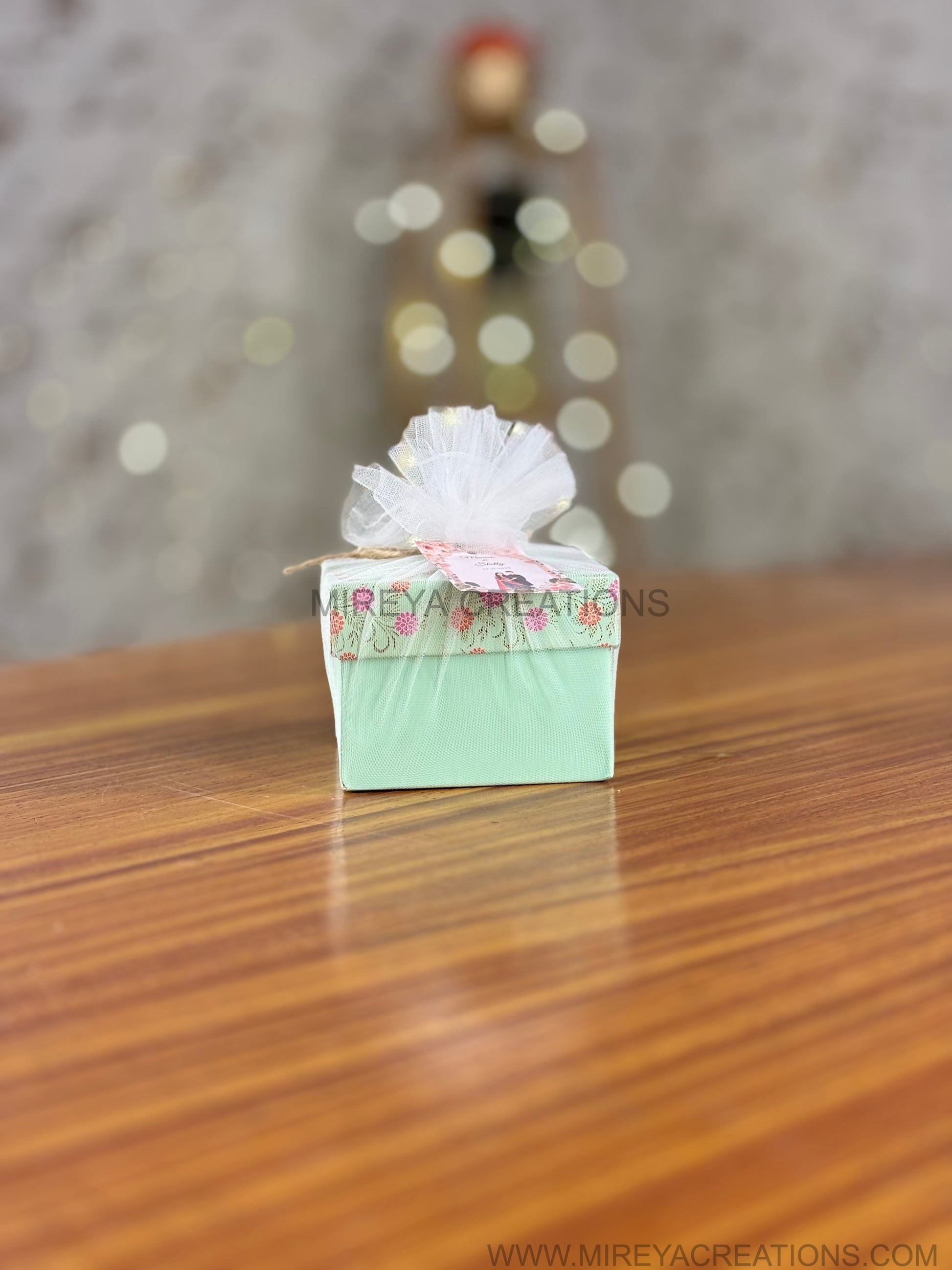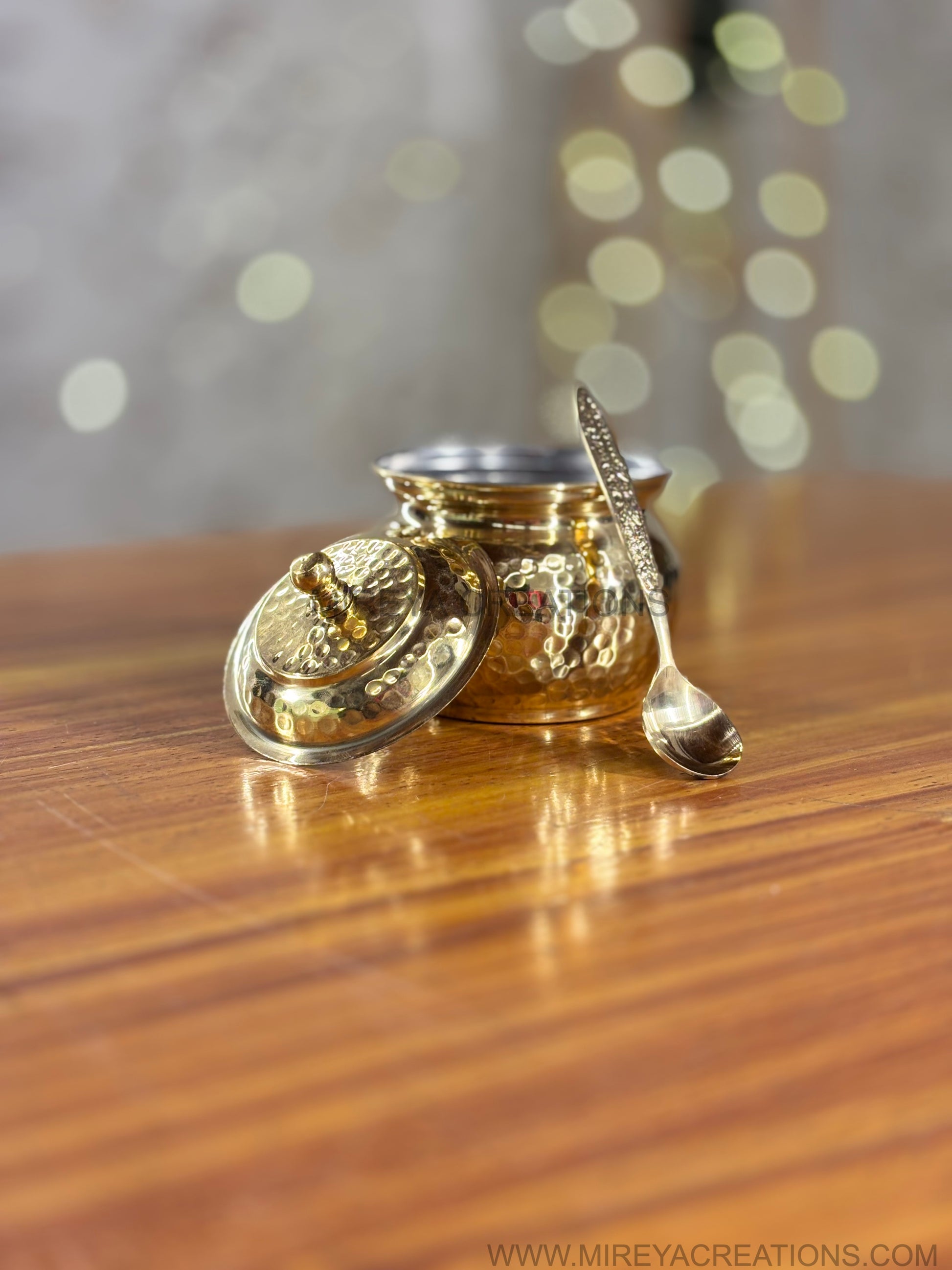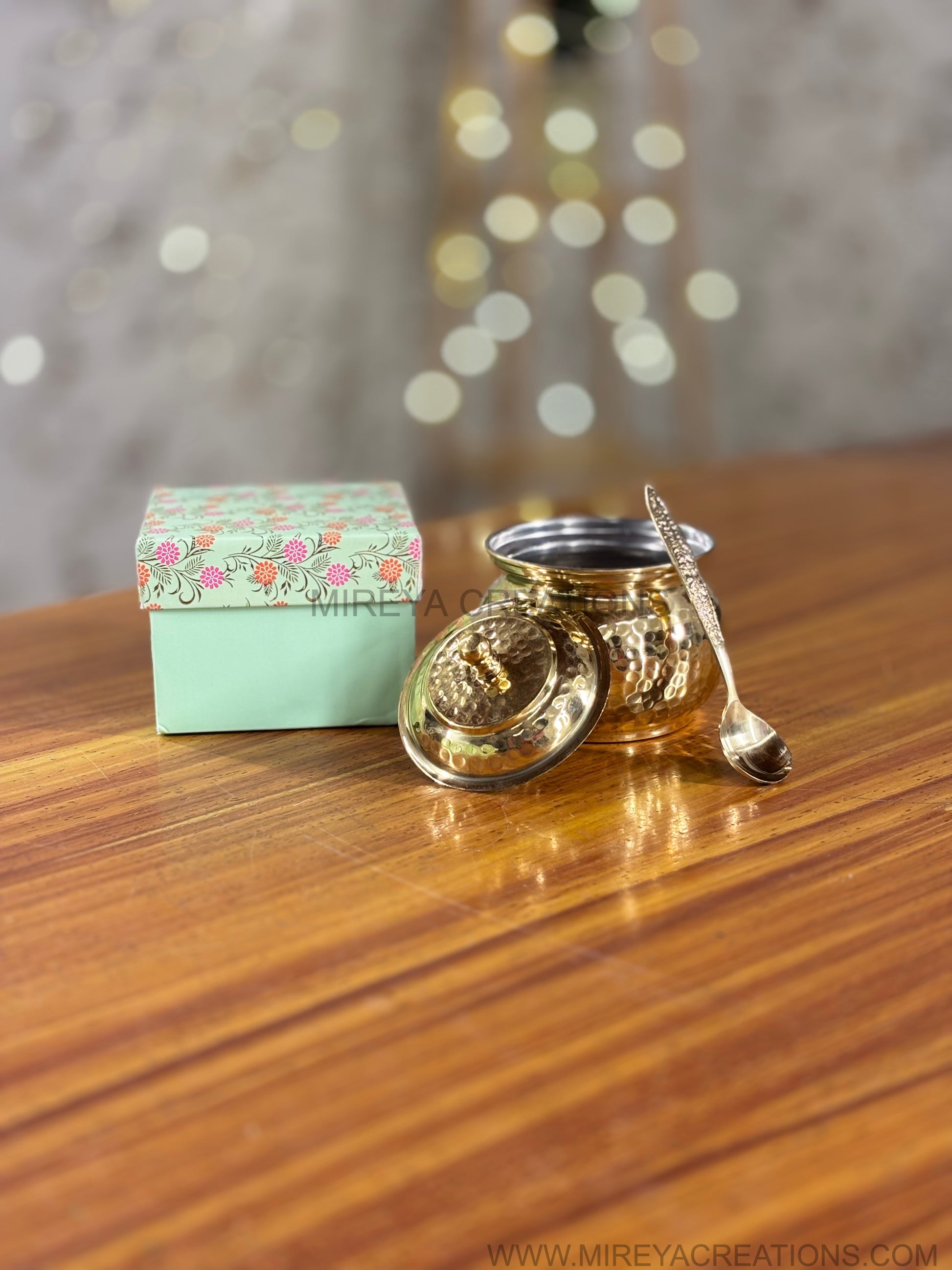 This hammered brass ghee pot from Mireya Creations is a compact yet luxurious piece that instantly elevates any table or countertop. The glossy hammered body paired with a smooth lid and knob gives it a rich, handcrafted look, ideal for storing dry fruits, mukhwas, sugar, candy or pooja essentials while doubling as a decor accent. Each jar is paired with a pastel green rigid box featuring a floral border, styled with white net and a personalised tag, so your return gifts arrive perfectly packed and ready to present.