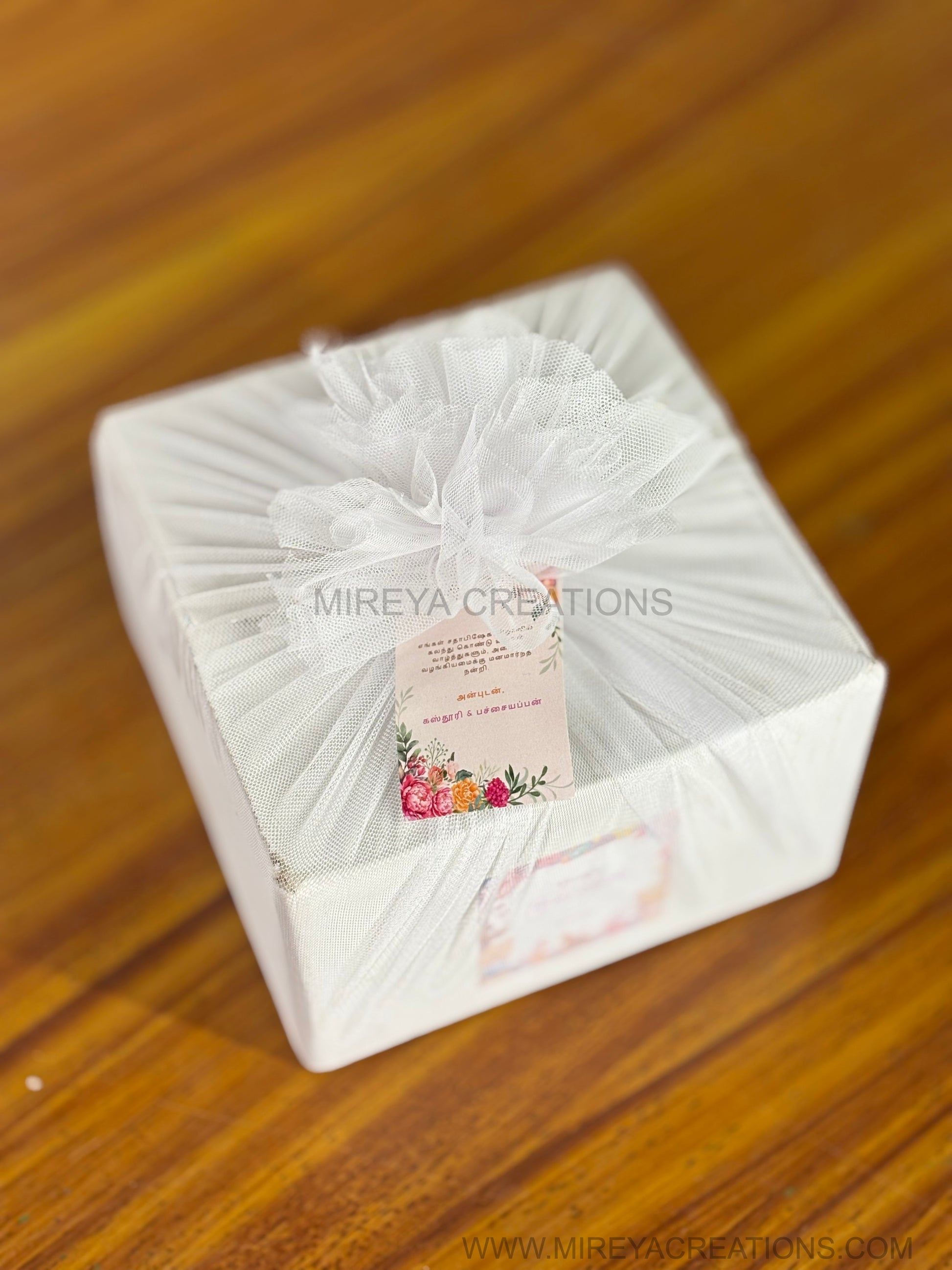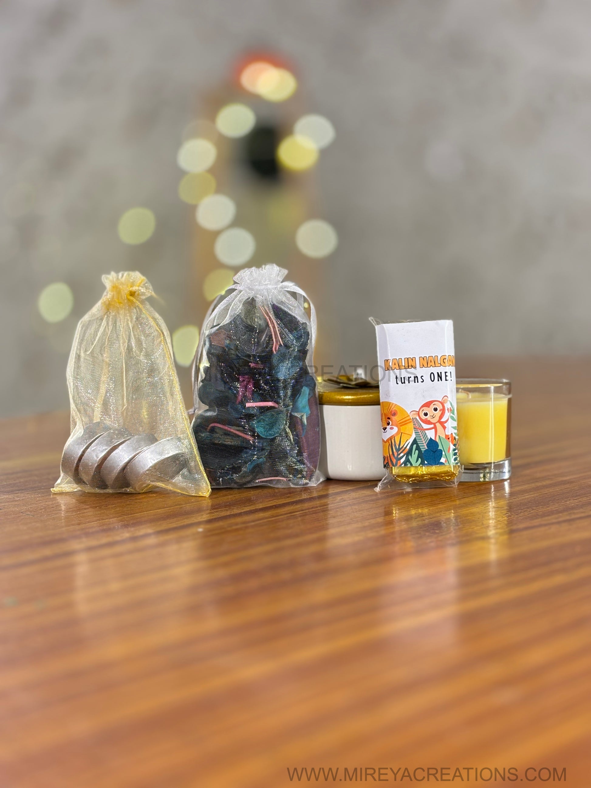 This kids’ mini hamper from Mireya Creations is a compact, budget friendly return gift that combines fragrance, light and chocolates in a playful theme. Designed specially for first birthdays, it pairs a customised mini candle with potpourri and tealights so parents enjoy the gift long after the party is over.