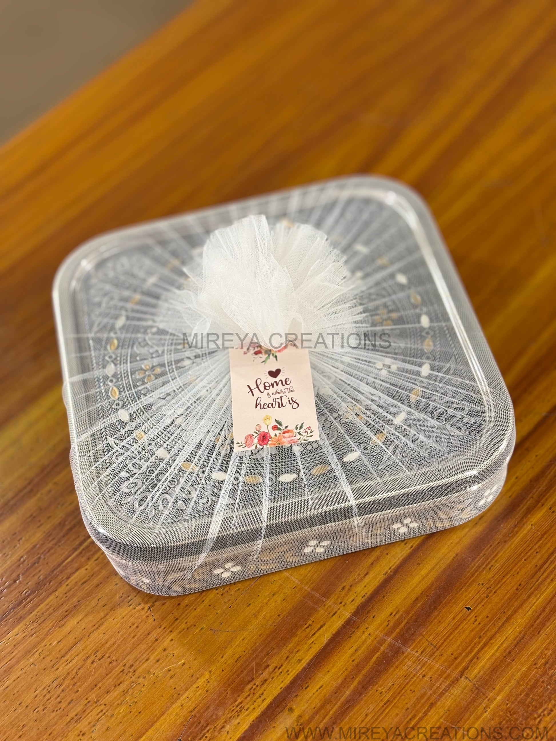 This meenakari square stainless steel masala box from Mireya Creations features an oxidised silver mandala print lid and matching floral border, giving a traditional yet contemporary look to your kitchen counter. Inside, nine deep round containers and a small spoon let you organise essential spices, mukhwas or even dry fruits in one easy to access place while the tight fit lid helps lock in freshness and aroma. The masala dabba comes gift wrapped in soft white net with a personalised tag, so it is ready to present as a thoughtful housewarming or wedding return gift without any extra packing effort.