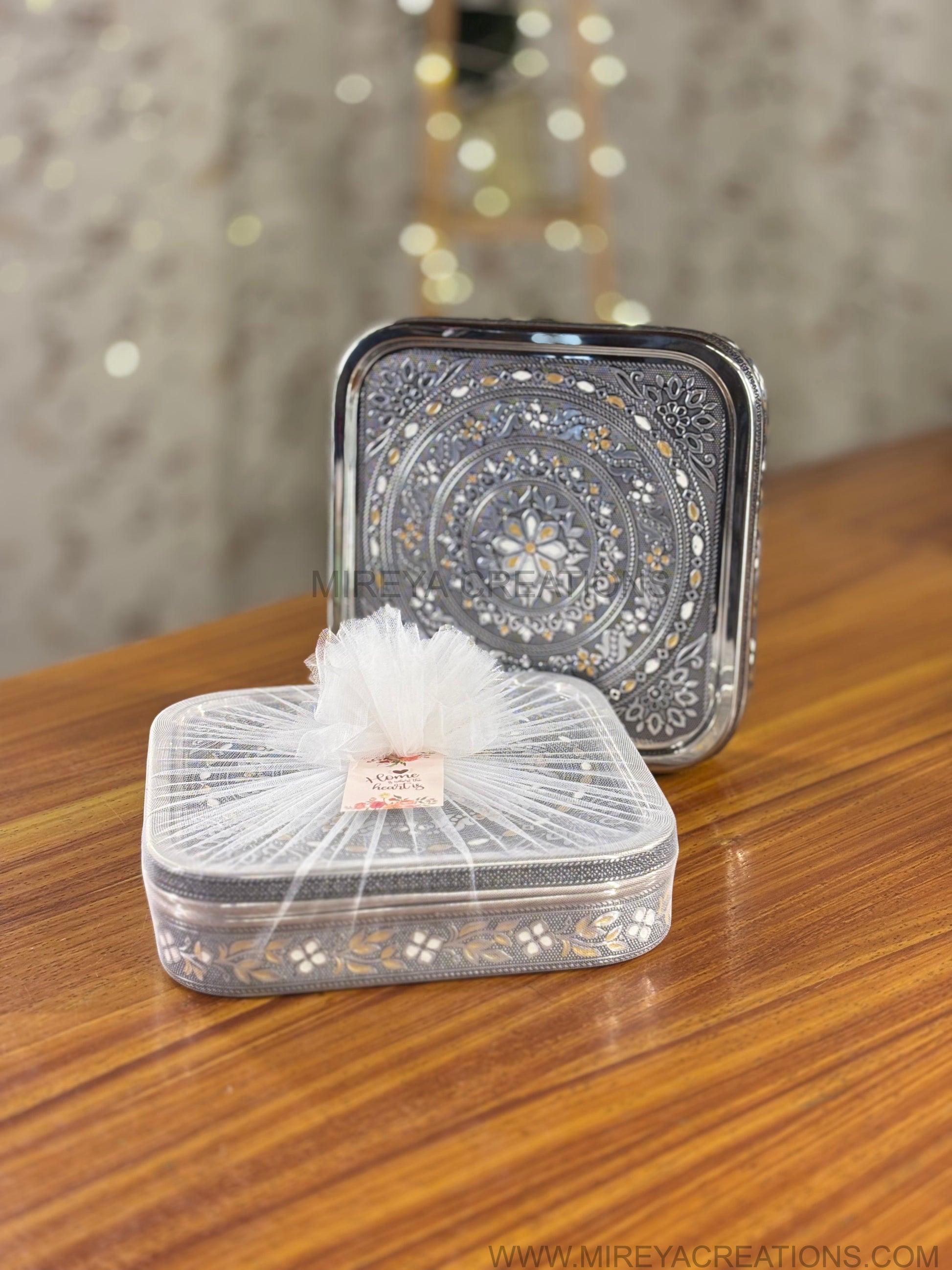 Meenakari Square Stainless Steel Spice Box Return Gift | Decorative Steel Masala Storage Box | Wedding & Housewarming Favor Under ₹2500
