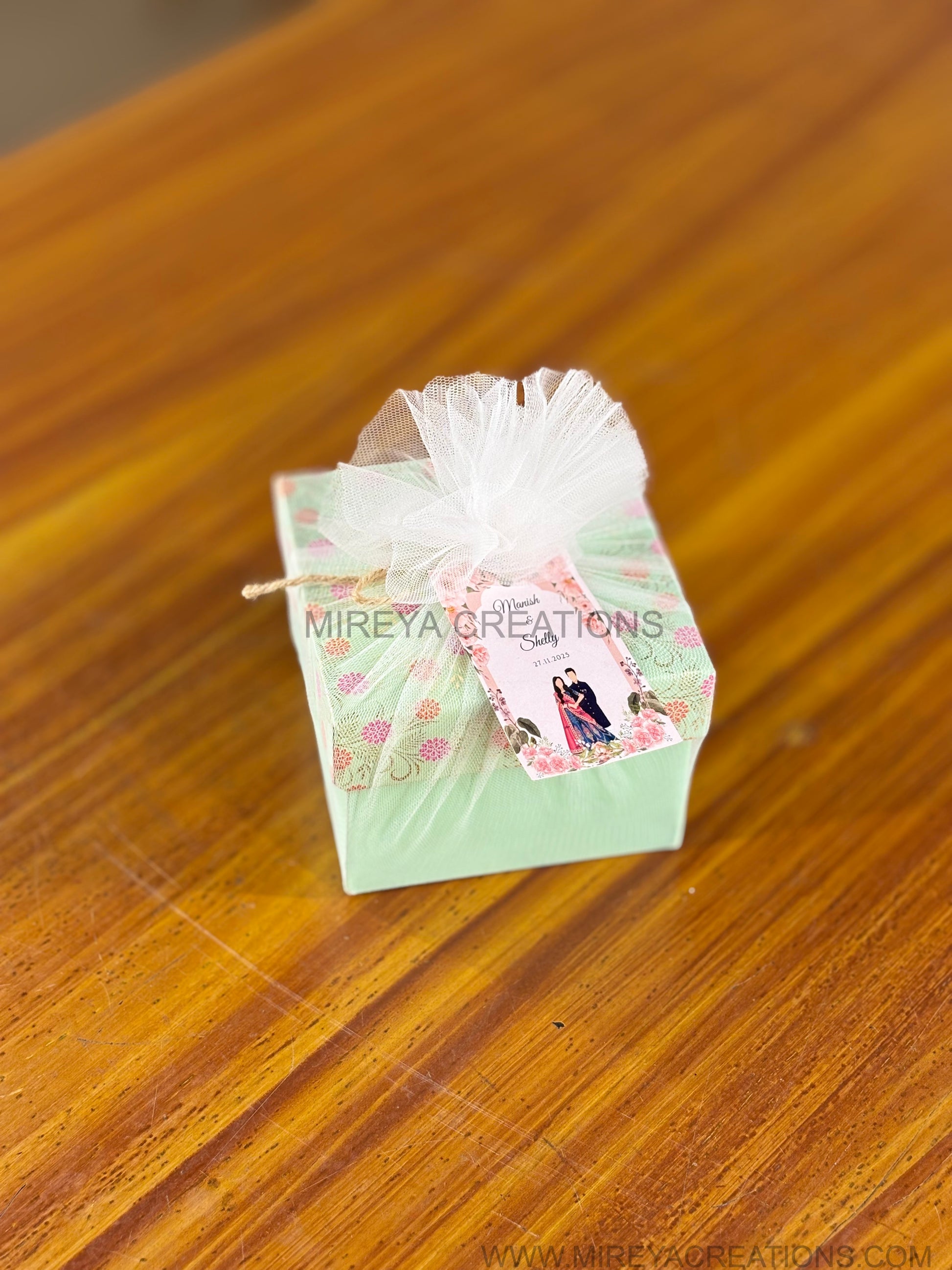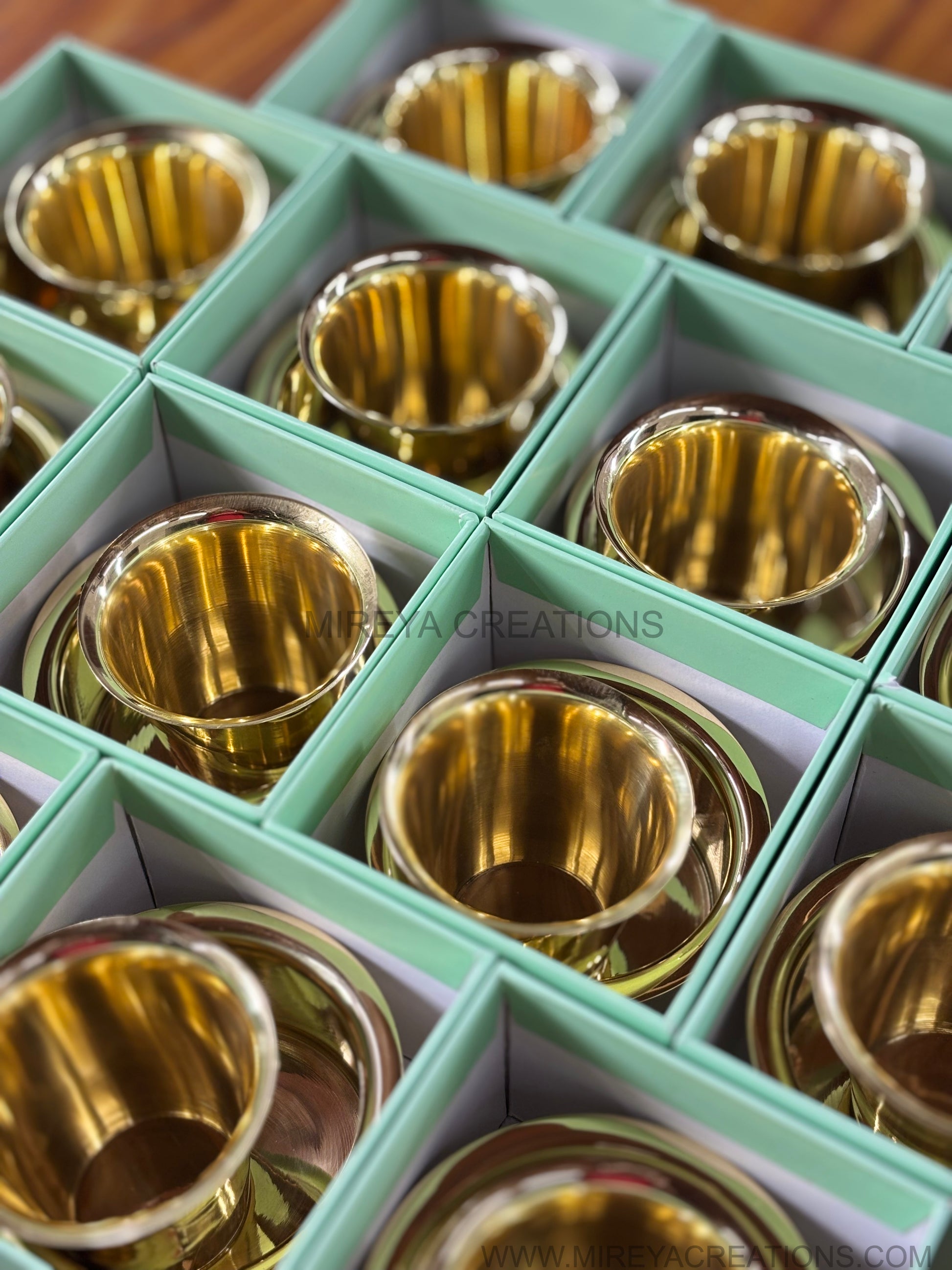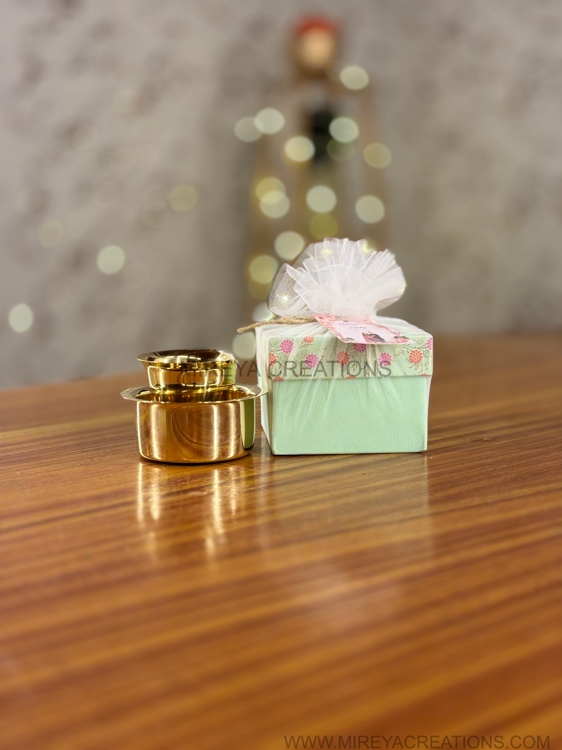 This mini brass dabara set from Mireya Creations brings the charm of authentic South Indian filter coffee into a tiny, giftable size. Each set includes a small brass tumbler and matching dabara bowl with a smooth polished finish, perfect for serving a kids version of filter coffee, payasam, badam milk or even as a decorative piece on your coffee corner. The pieces arrive nestled in a pastel green rigid box with floral border, topped with white net and a personalised tag, so they are completely ready to hand over as elegant return gifts.