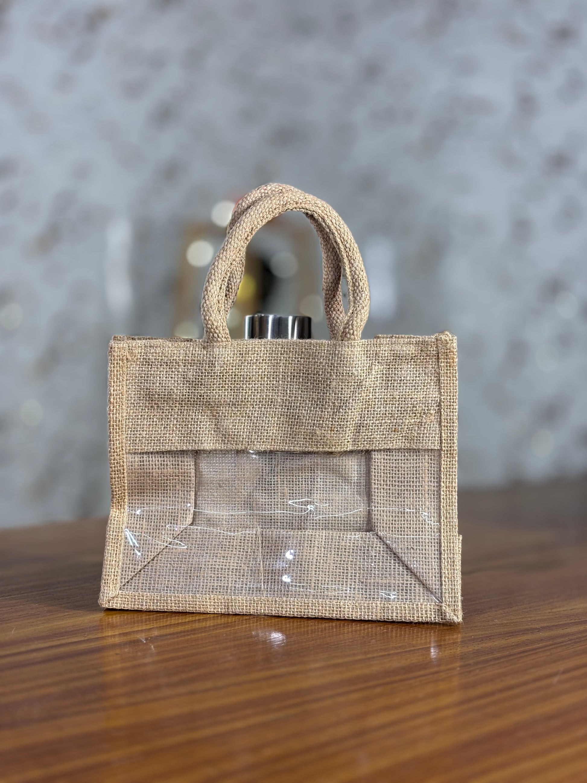 Mireya Creations’ Mini Jute Jar Gift Bag with Window is a stylish, sustainable way to present petite hampers for weddings, poojas, and corporate events. The natural jute body paired with a clear PVC front panel lets guests see the beautifully arranged jars or goodies inside while keeping them secure, turning simple contents into a premium looking gift. Short padded jute handles make it easy to carry, and the compact footprint is ideal for 1–2 small jars, candles, gourmet treats, or customised favours, making it a versatile choice for curated return gifts and brandable hampers.
