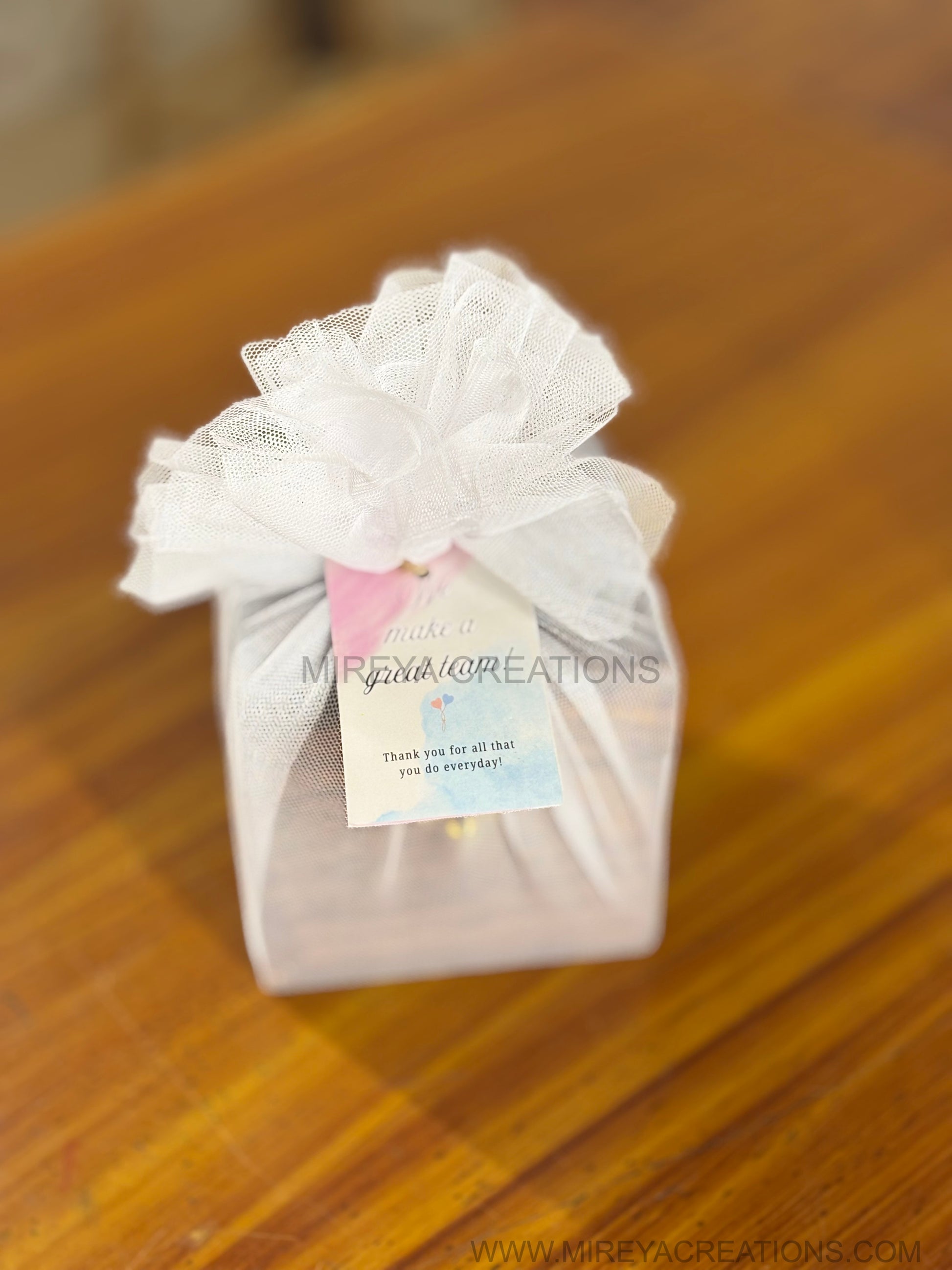 Optional net gift wrapping with bow and personalised tag