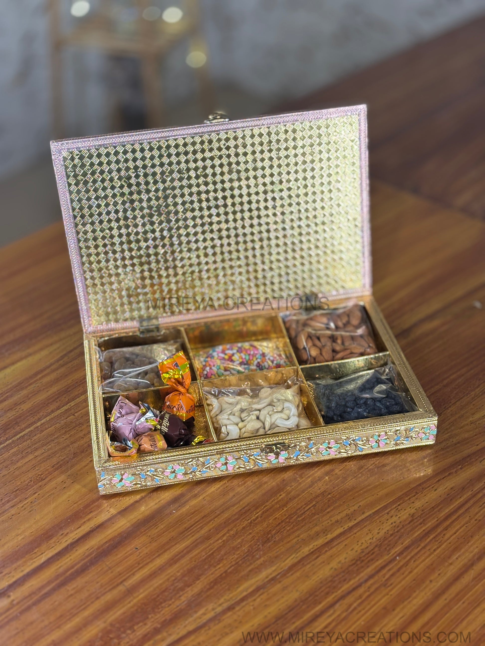 Delight your guests with this pastel meena work dry fruit and chocolate hamper from Mireya Creations. The long rectangular box features intricate floral and geometric detailing in soft gold and pastel tones, giving it a royal yet subtle look that suits both traditional and modern events. Pre packed with almonds, cashews, raisins, colourful mukhwas and assorted chocolates, it becomes a complete ready to gift hamper that looks luxurious on any return gift table.
