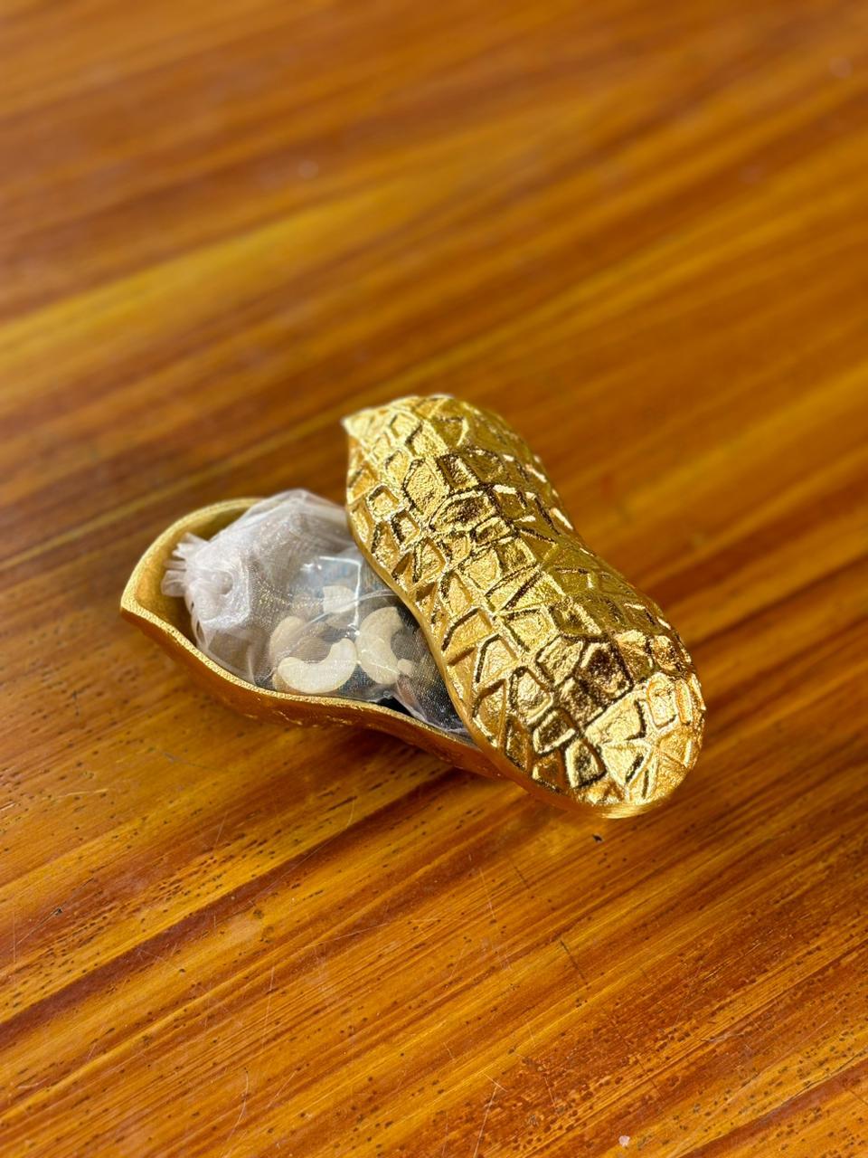 Add a touch of tradition and elegance to your celebrations with our Golden Peanut Dry Fruit Box, a unique and eye-catching return gift that symbolizes prosperity and abundance. Crafted in the shape of a peanut and finished with a rich golden texture, this box opens up to reveal a small organza pouch filled with premium dry fruits.