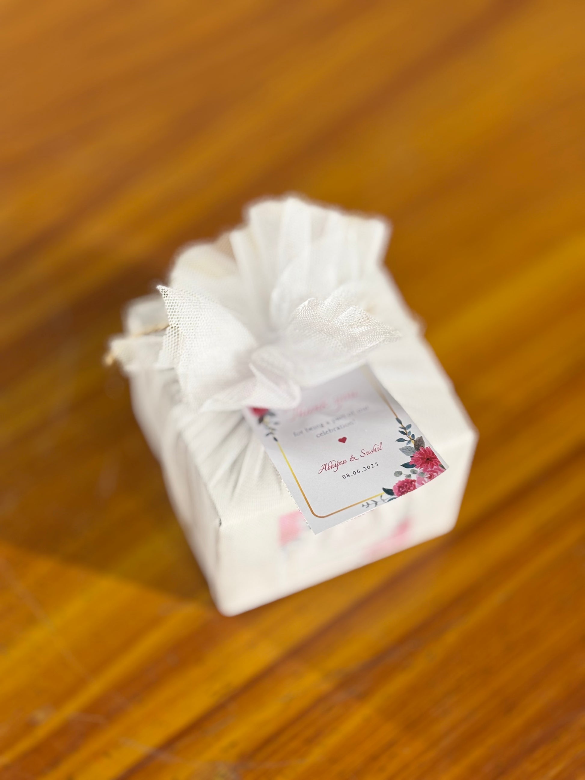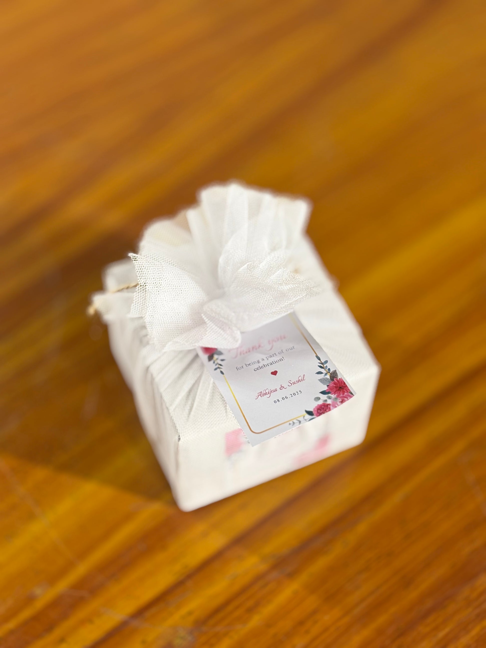 Light up your festivities and thank your guests in style with Mireya Creations’ Personalized Floral Jar Candle with Net Pouch the perfect blend of elegance, personalization, and practicality for weddings, engagements, baby showers, and more. Each set features a premium scented jar candle customized with your initials and event date, paired with a beautifully coordinated net pouch and floral motif tag. Designed for those who want memorable, photo worthy, and useful return gifts, this candle set delights all senses and makes every guest feel cherished. If you’re searching for unique and affordable return gifts in India, this bespoke combination stands out for its presentation and meaning.