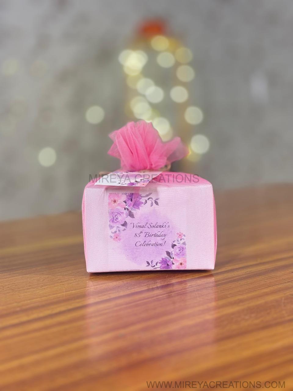 Elevate your celebration with this Premium Floral Metal Box Gift Set from Mireya Creations, designed to impress your guests with elegance, sweetness, and thoughtful presentation. This stunning return gift features a beautifully crafted metal box with an embossed floral lid, paired with a vibrant pink net pouch filled with assorted chocolates.