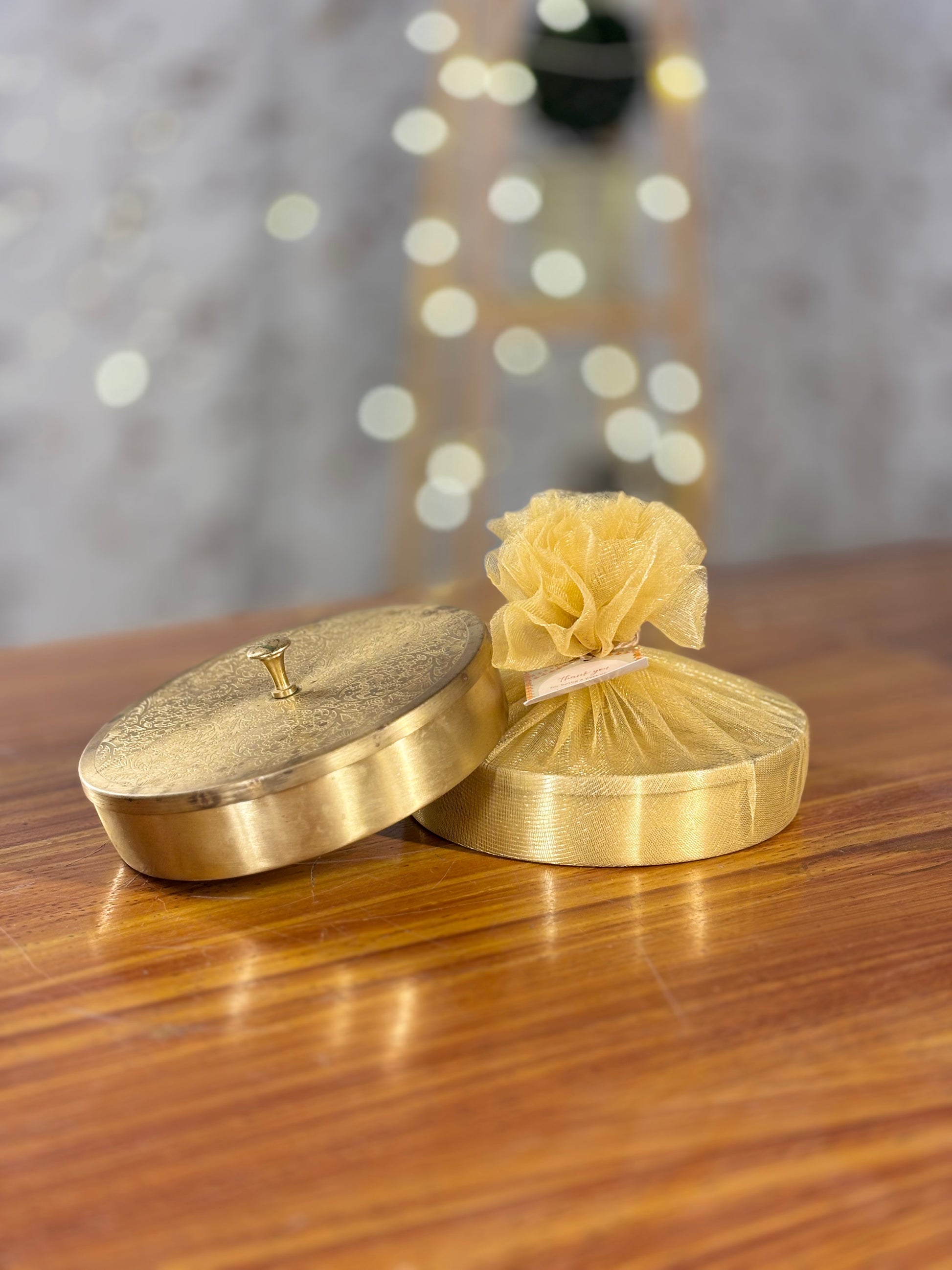 Gift the charm of Indian heritage with Mireya Creations’ Traditional Brass Masala Box with Net Pouch a timeless return gift blending superior craftsmanship and practical utility. Made from pure brass with intricate engraving, this classic masala dabba features seven removable spice containers, perfect for storing a variety of spices, dry fruits, or even festive treats. The box’s airtight lid preserves freshness and adds a luxurious golden sheen, while the matching net pouch and custom tag complete the gifting experience. Ideal as a wedding, housewarming, grihapravesh, or corporate gift, this brass spice box is both a statement of tradition and a functional keepsake.