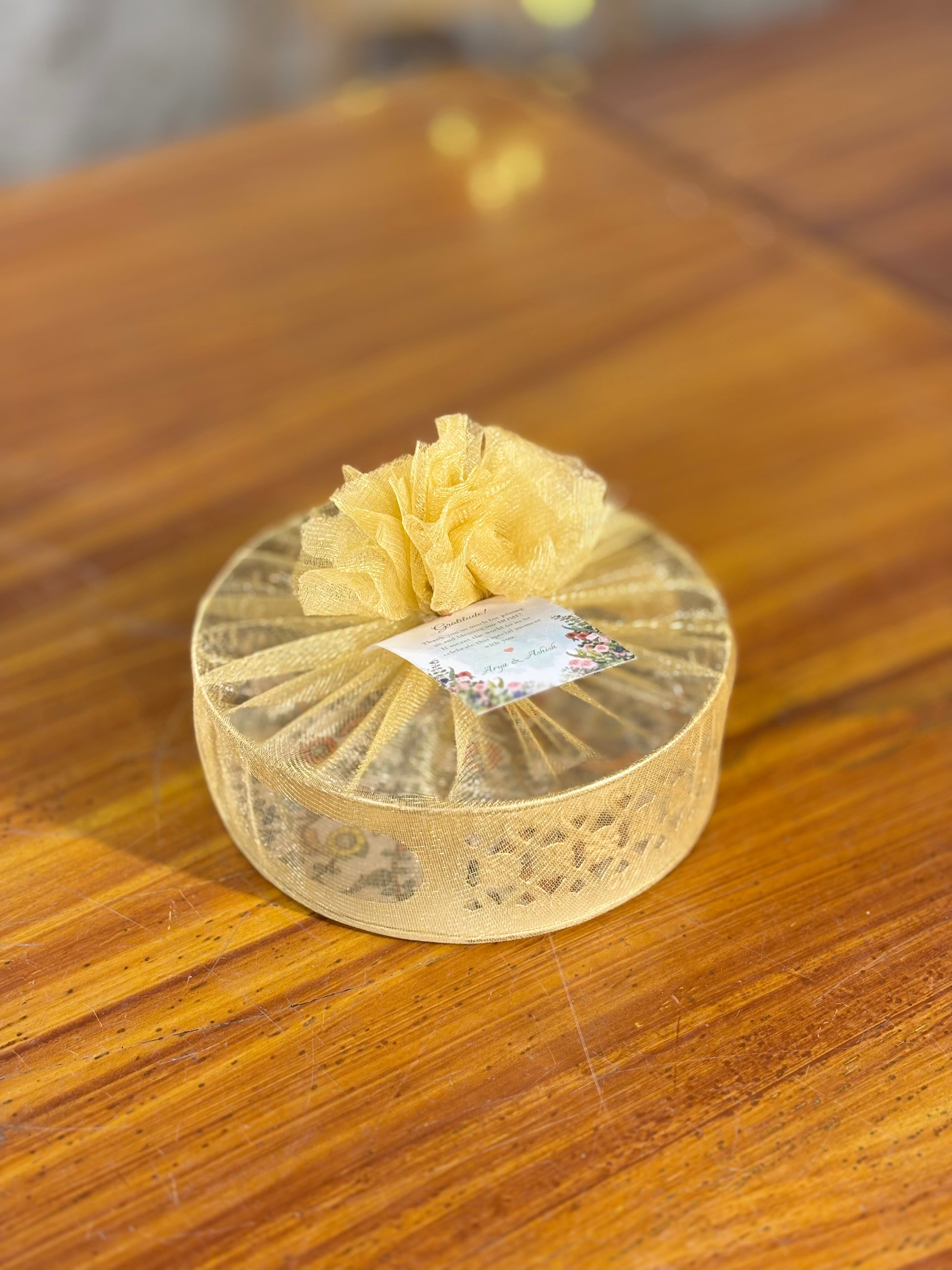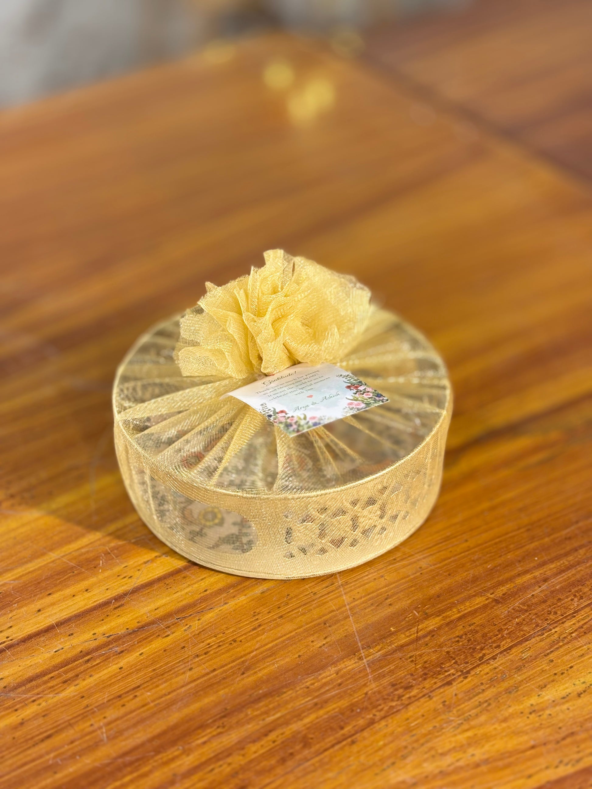 Elevate your celebrations with Mireya Creations’ Floral Gold Mesh Decorative Box with Net Wrap a luxurious return gift that artfully blends traditional elegance and modern style. This sturdy round box features a golden mesh exterior with a vibrant floral inner lining, creating a beautiful presentation for sweets, dry fruits, jewelry, or keepsakes. Finished with a matching gold net and a custom tag, it brings opulence and practicality to weddings, housewarmings, Diwali, or corporate events. Event hosts seeking unique, reusable, and stylish gifting will find this box a standout choice for delighting every guest.