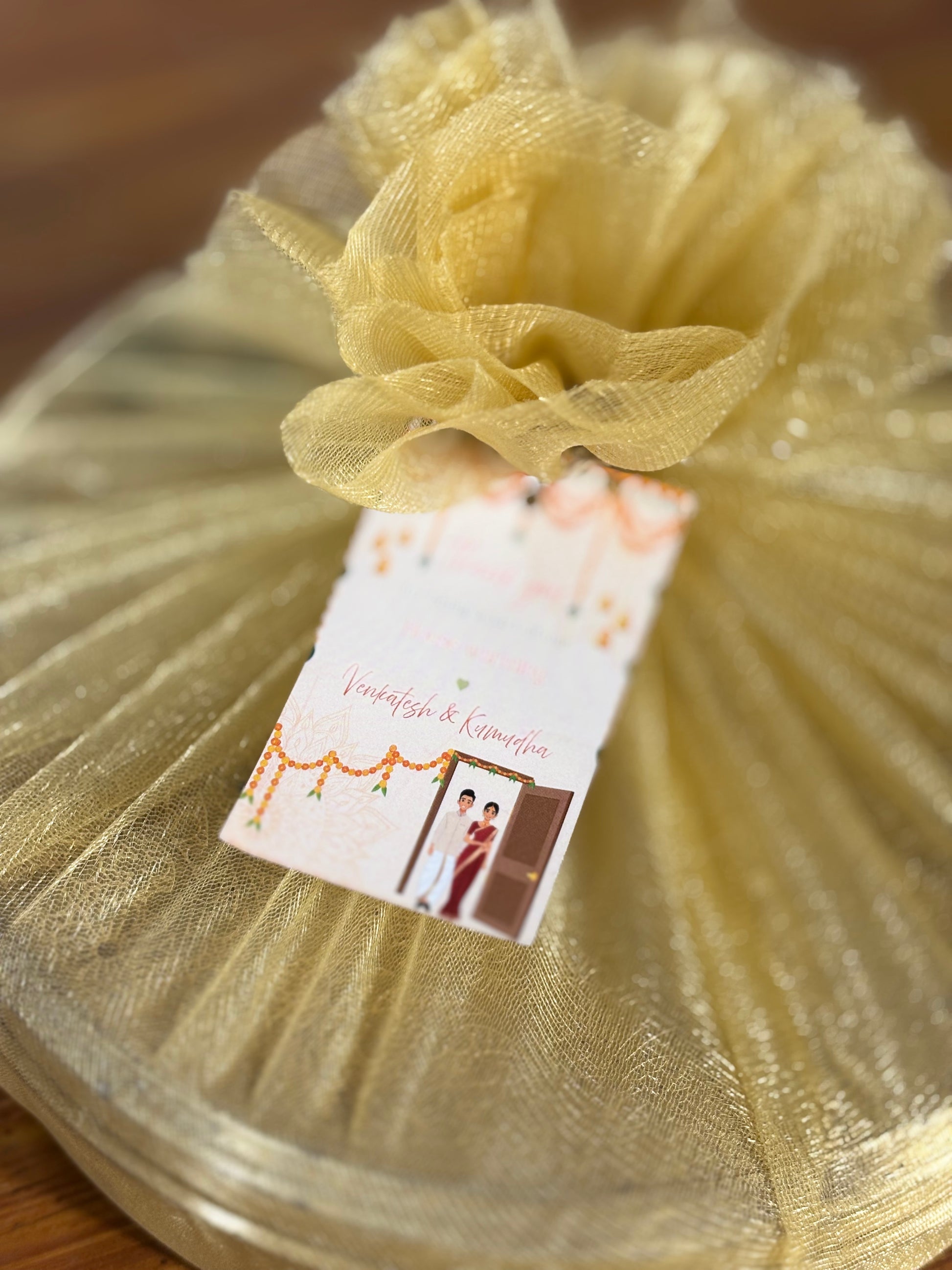 Honor tradition with luxury through Mireya Creations’ Premium Brass Masala Box with Net Pouch a refined return gift merging timeless Indian craftsmanship and elegant presentation. Crafted from high quality, food safe brass, this masala dabba features a stunning engraved floral lid, seven removable spice containers, and a matching spoon. Each box is gift wrapped in a gold net pouch and finished with a custom occasion tag, making it an ideal present for weddings, housewarmings, poojas, and milestone events. This utility rich keepsake blends Indian heritage and contemporary elegance, ensuring guests remember your occasion with every use.