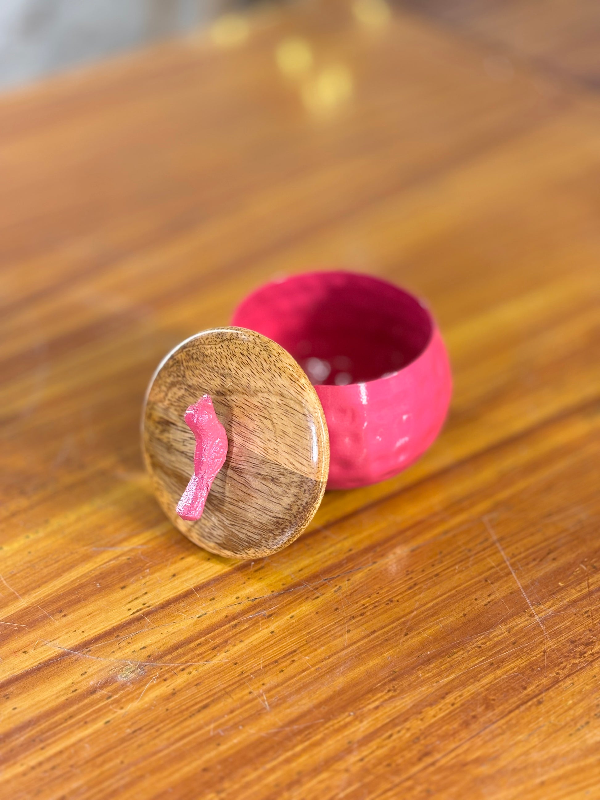 One premium ceramic jar (choice of pink or yellow) with airtight wooden bird lid