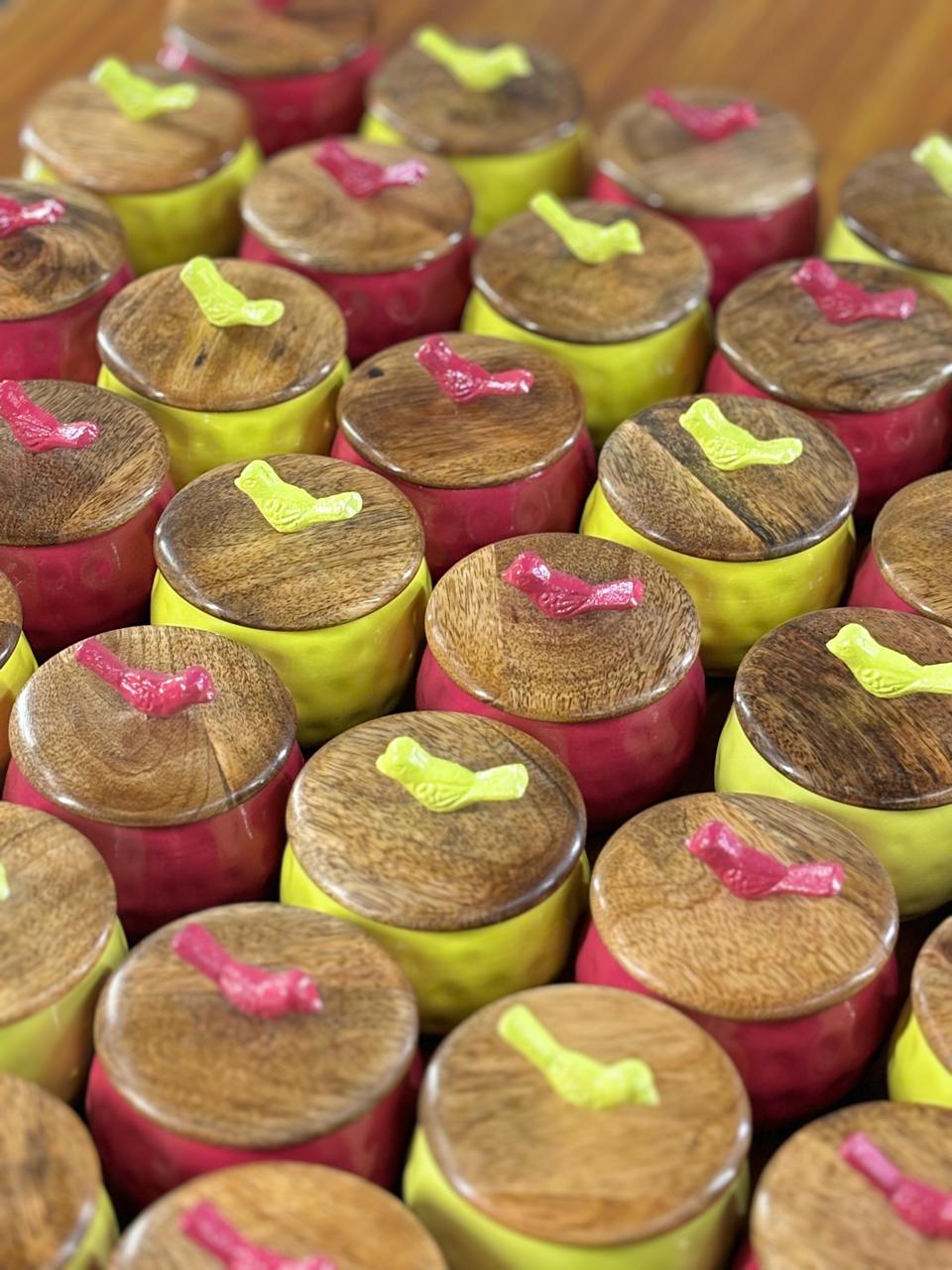 Charm your guests with Mireya Creations’ Colorful Bird Ceramic Jar Return Gift a playful and premium keepsake, perfect for birthdays, baby showers, and festive celebrations. Each glossy ceramic jar comes in a lively pink or yellow finish, topped with a natural wooden lid and a cute bird figurine knob, creating a delightful mix of tradition and whimsy. These gift ready jars come elegantly packed in a coordinated net pouch with a custom event tag, making them hassle free for bulk or party distribution. For event hosts looking for unique, reusable, and eye catching return gifts, these bird jars are a true crowd pleaser.