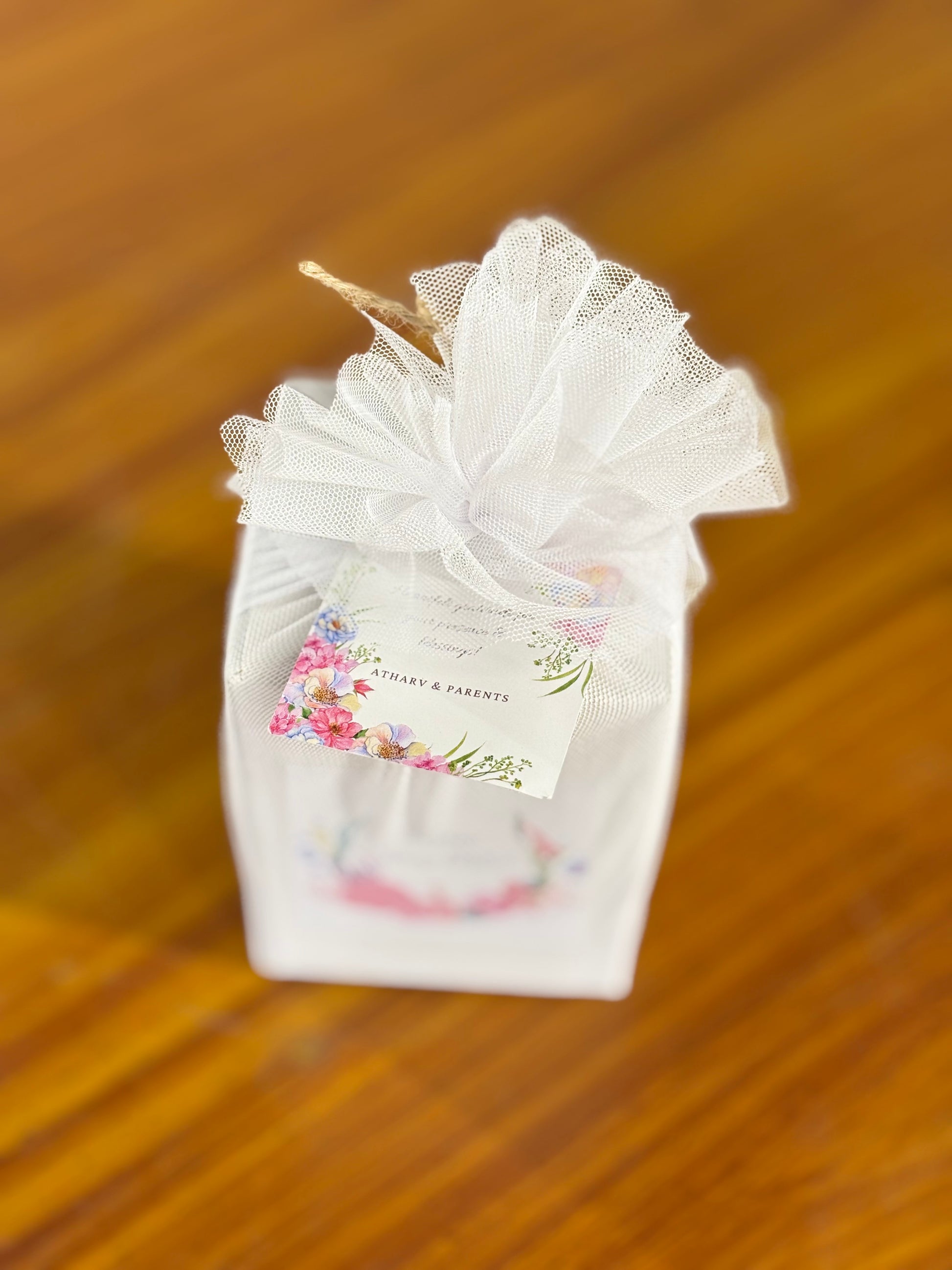 Net pouch with personalized tag makes it event ready and memorable