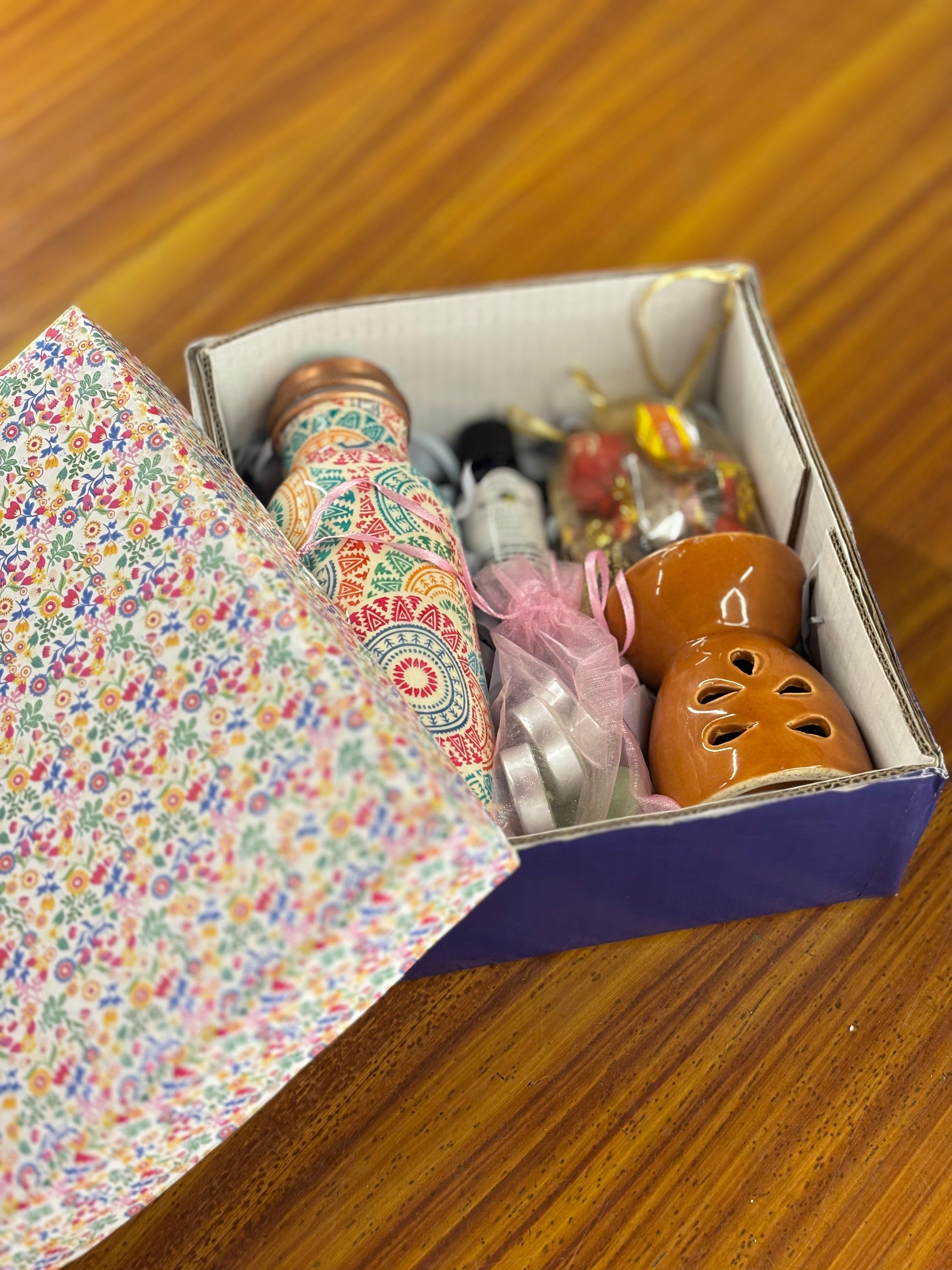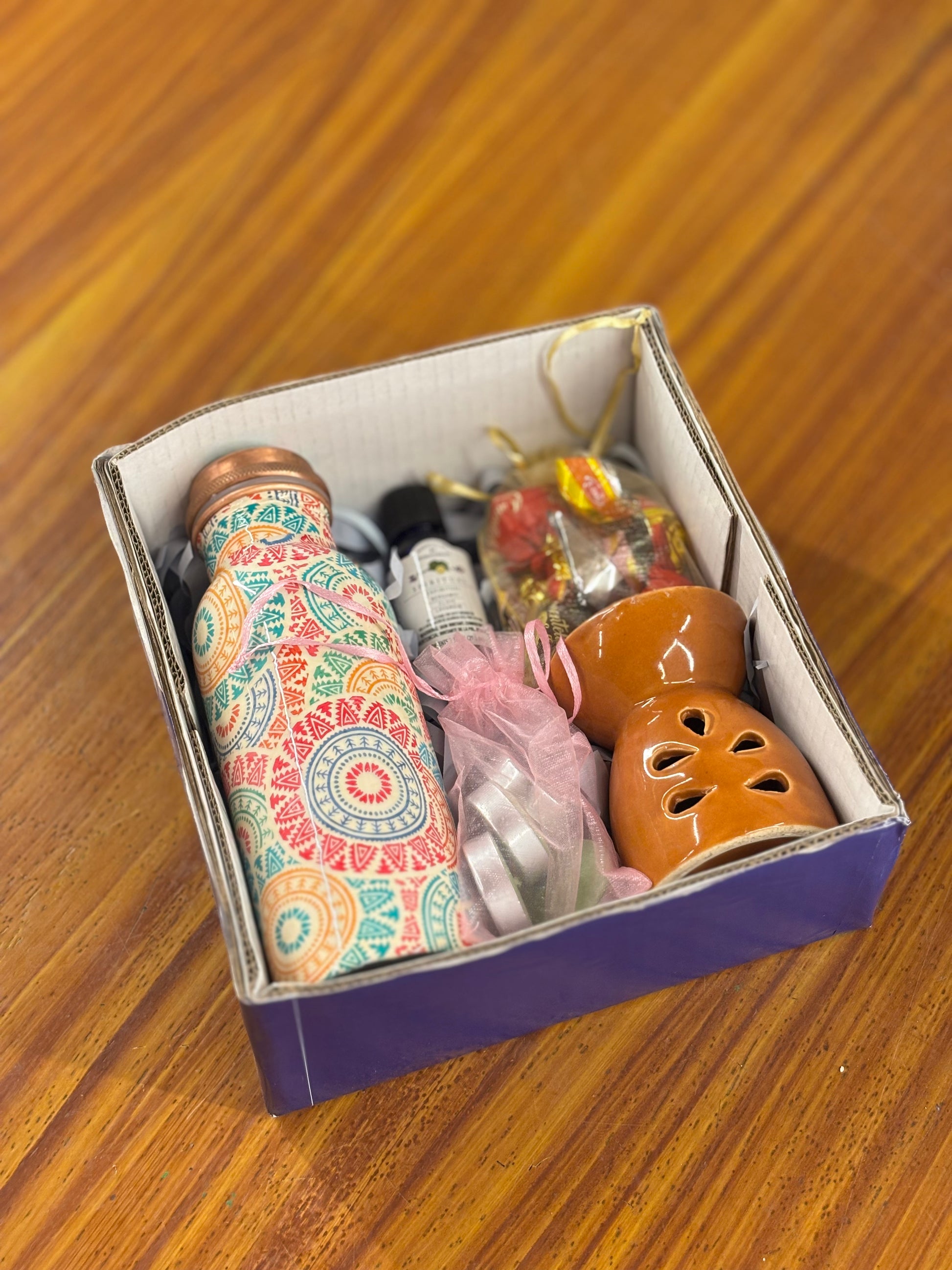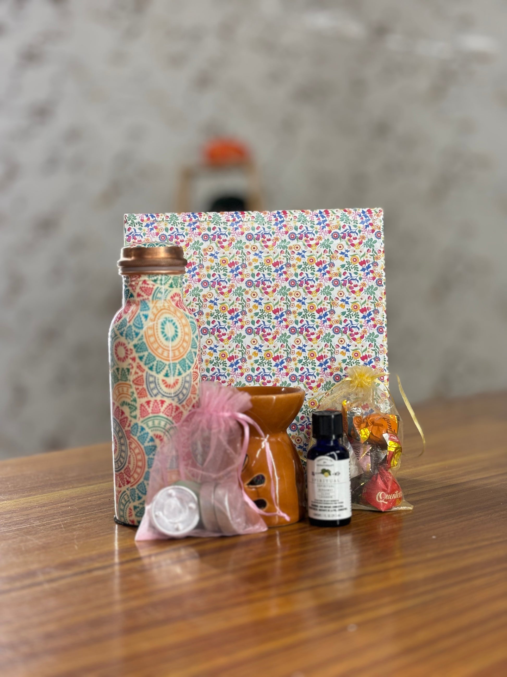 Printed Copper Bottle & Aroma Gift Set Return Gift | Ceramic Burner, Essential Oil, Tea Lights & Chocolates | Wedding & Housewarming Favor Under ₹1400