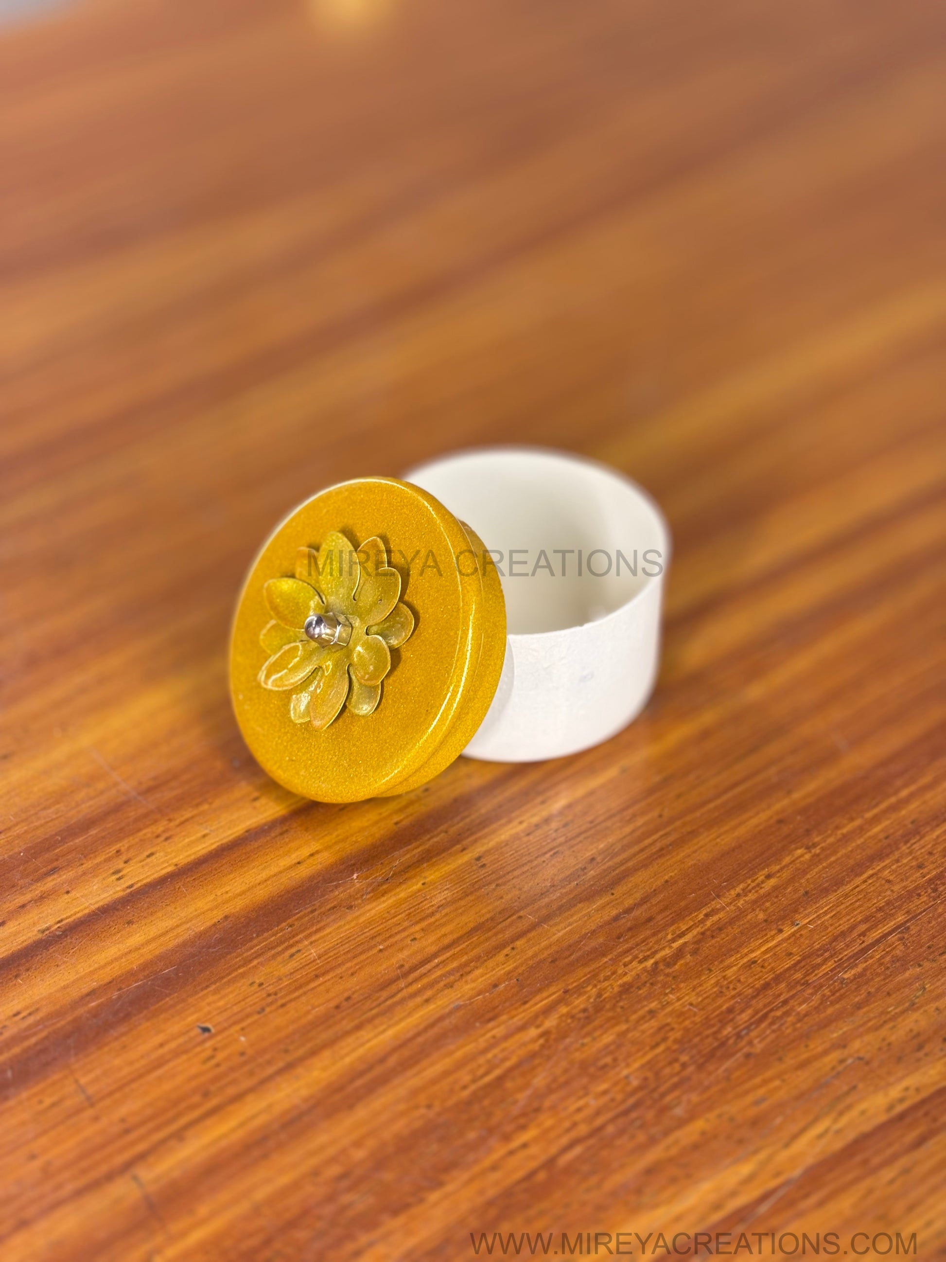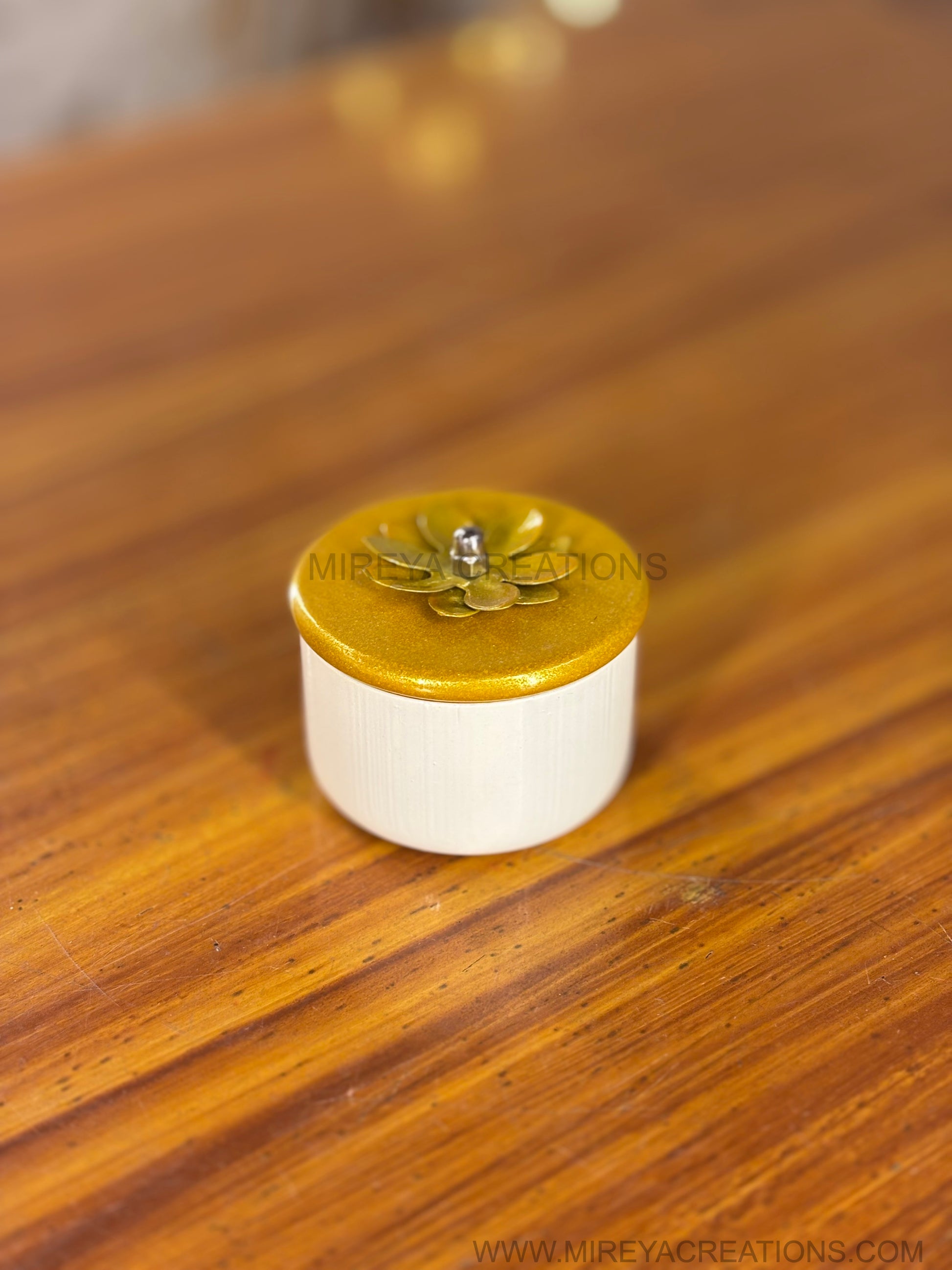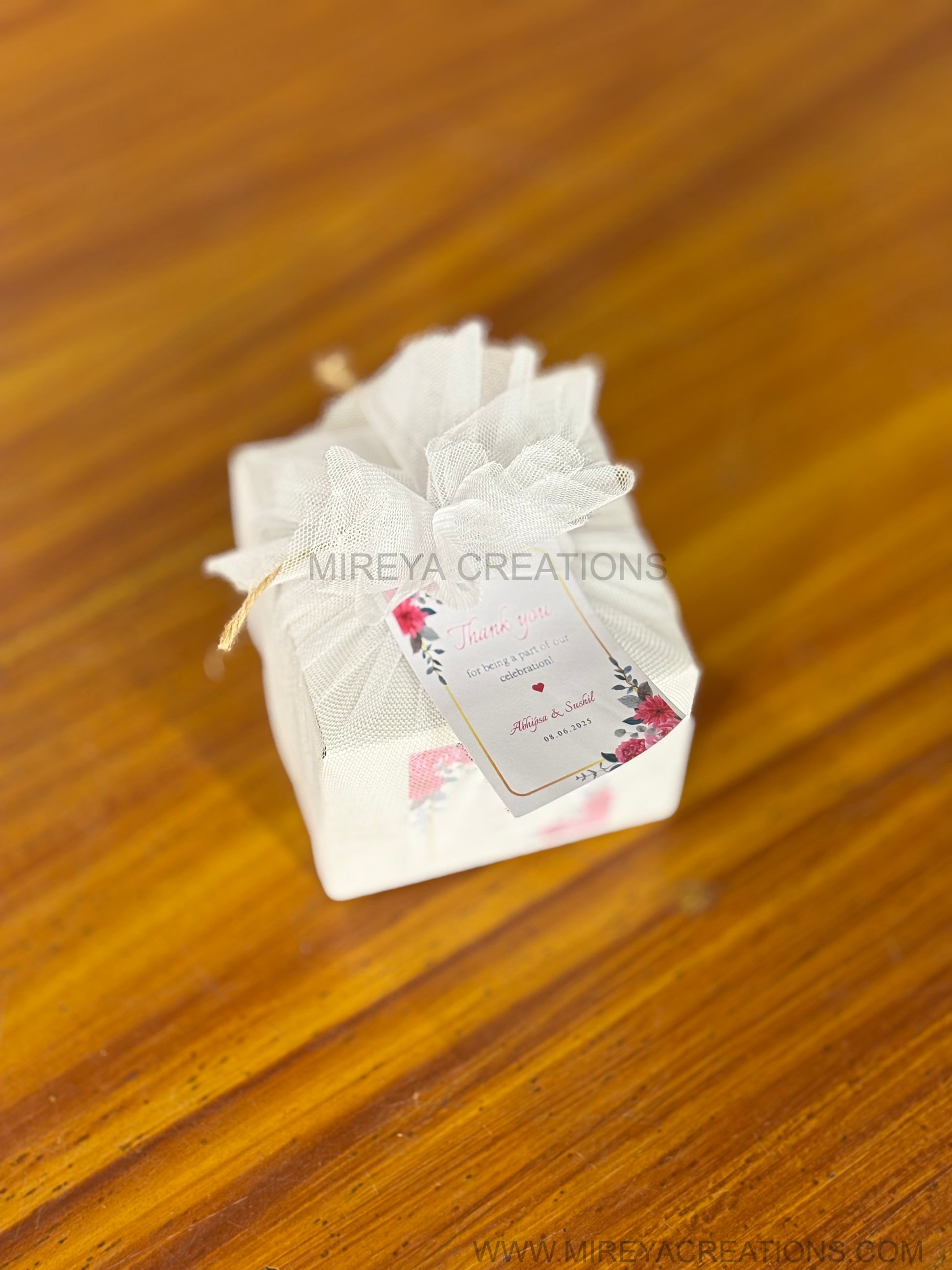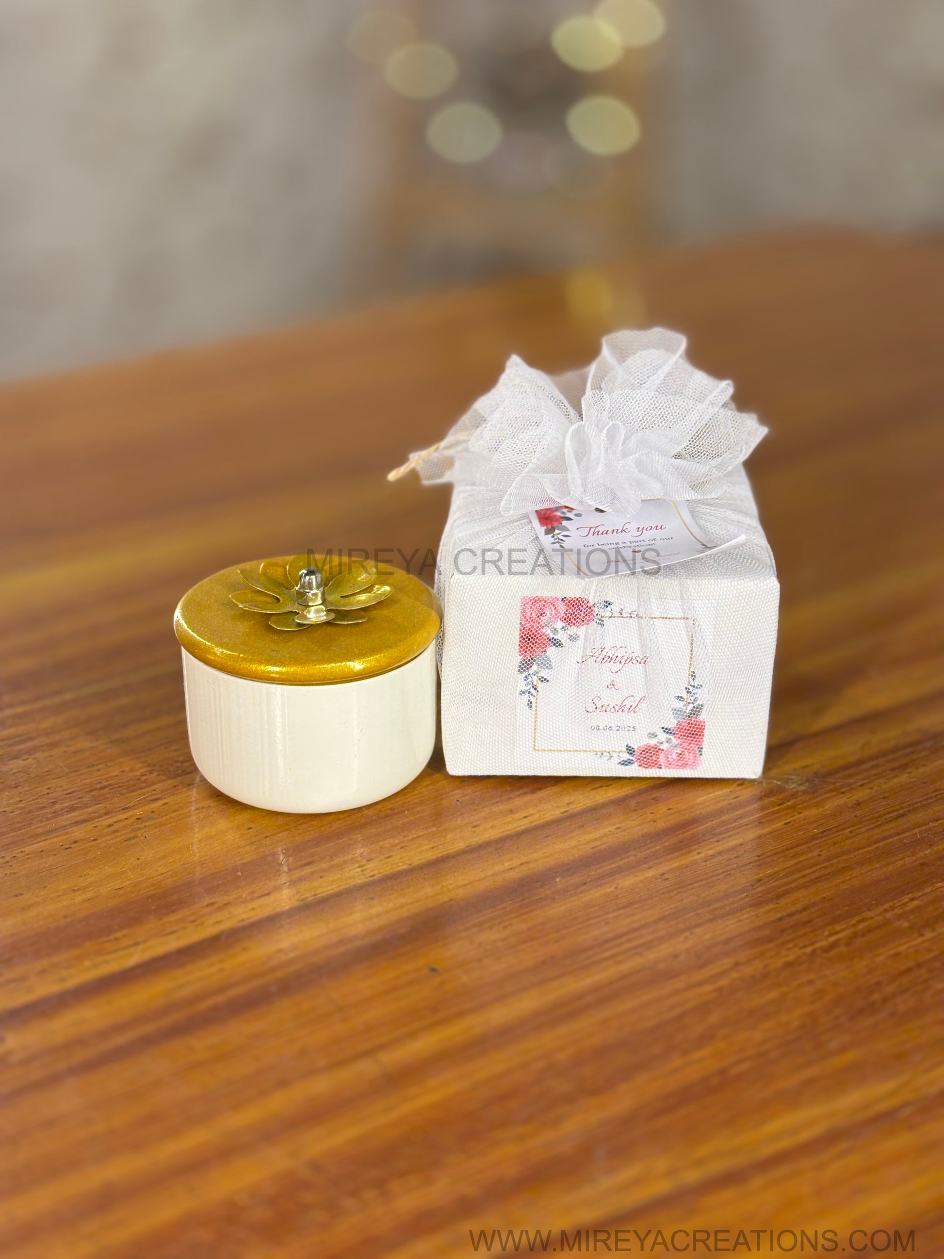 The decorative lotus jar and net wrapped box make this a soft, elegant return gift set from Mireya Creations, perfect for intimate functions. The neutral ivory and gold palette with floral detailing suits both traditional and contemporary themes.