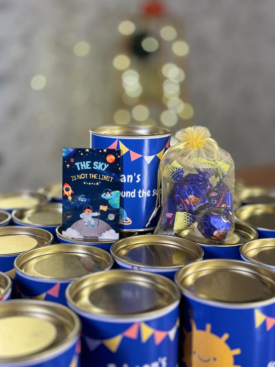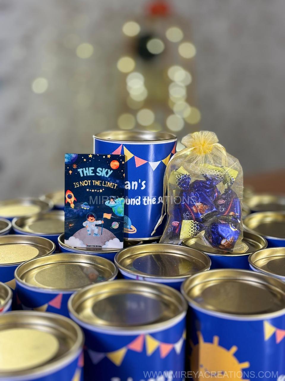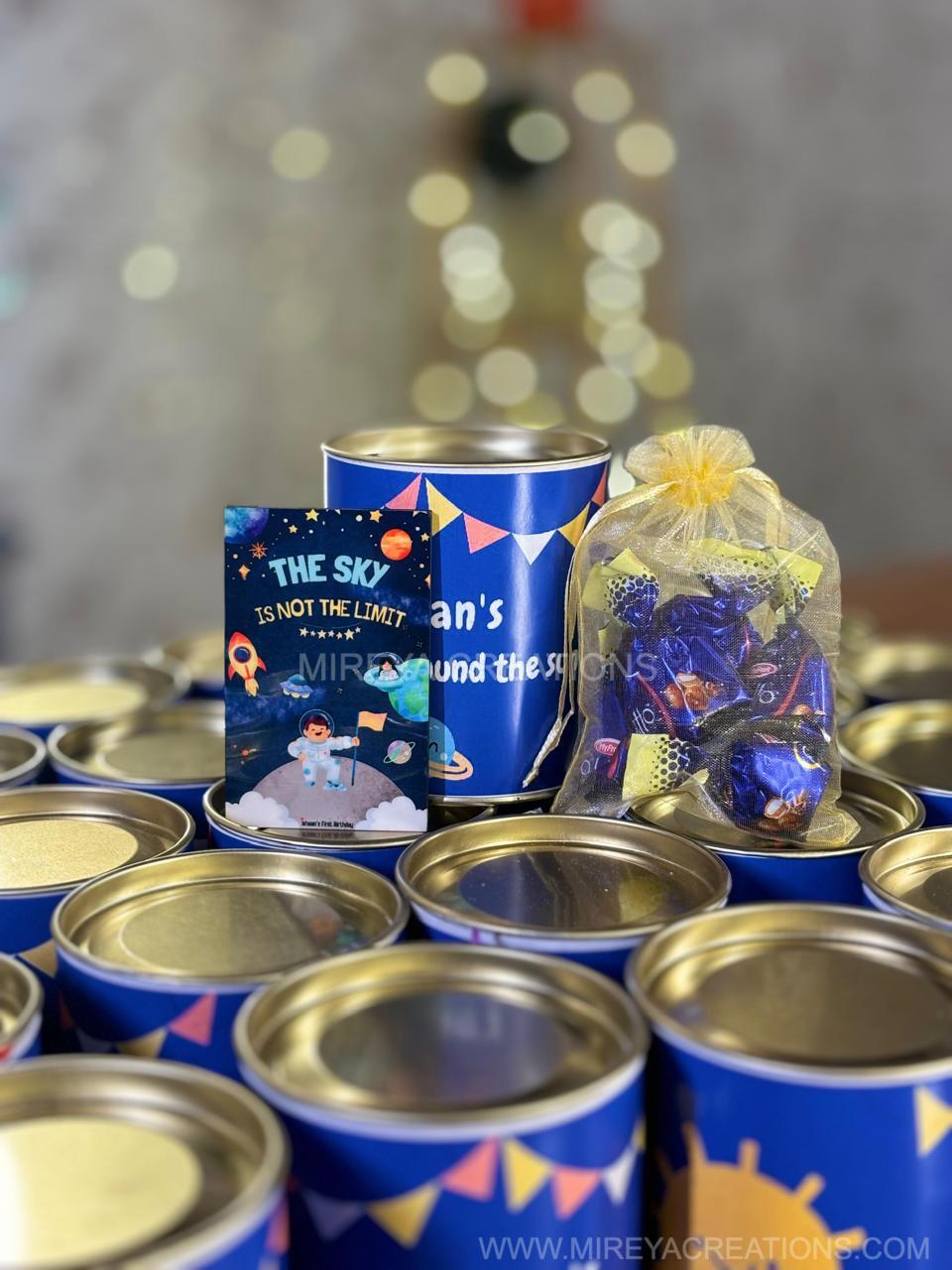 Make your child’s birthday unforgettable with our Space Theme Return Gift Tin Box (theme can be customised ) designed specially for little explorers who love rockets, planets, and astronauts! This premium reusable tin comes with a vibrant, high quality outer wrapper decorated with planets, stars, and colorful flags, creating the perfect out of the world gifting experience.