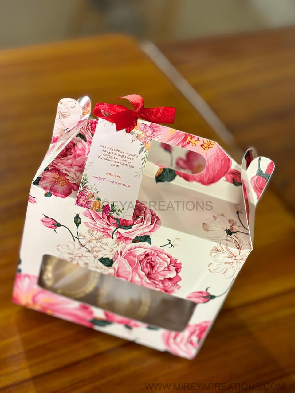 Make your festivals and ceremonies unforgettable with Mireya Creations Floral Gable Box Diya Hamper, a ready to gift combo that blends tradition with elegant packaging. The floral printed carry box holds a set of six golden diyas wrapped in white net along with mini kumkum and haldi packs decorated with roses, making it a perfect spiritual favour for poojas, Diwali and weddings.