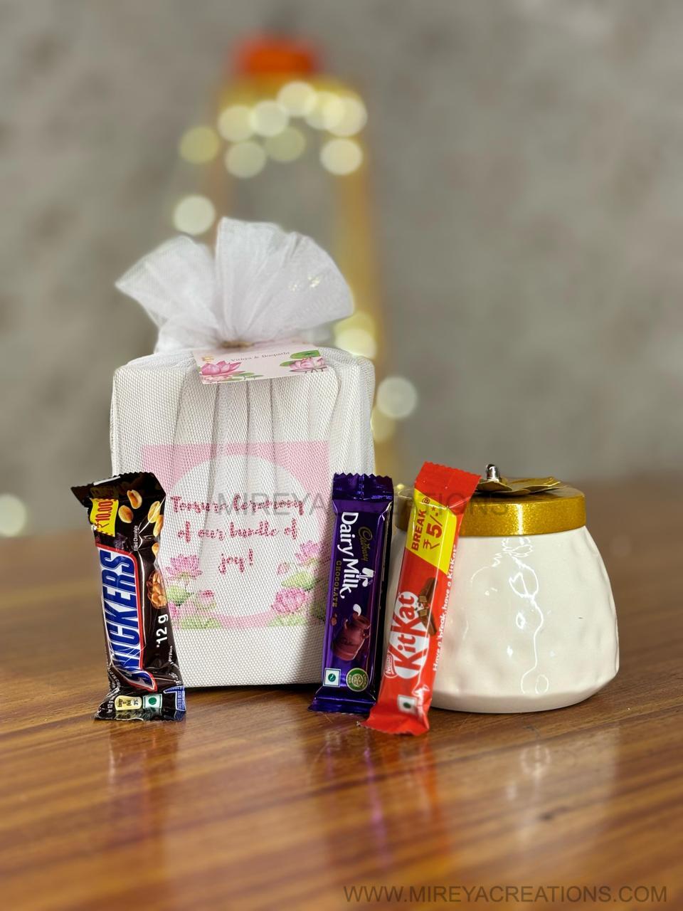 Make celebrations sweeter and more memorable with this vibrant return gift hamper from Mireya Creations. Each hamper includes a stylish floral keepsake jar, a selection of popular chocolates, and an assortment of rich toffees, beautifully packaged in a personalized box making it the ideal thank you gift for weddings, birthdays, and festive gatherings. This hamper brings together elegance, taste, and thoughtful gratitude in one delightful package.