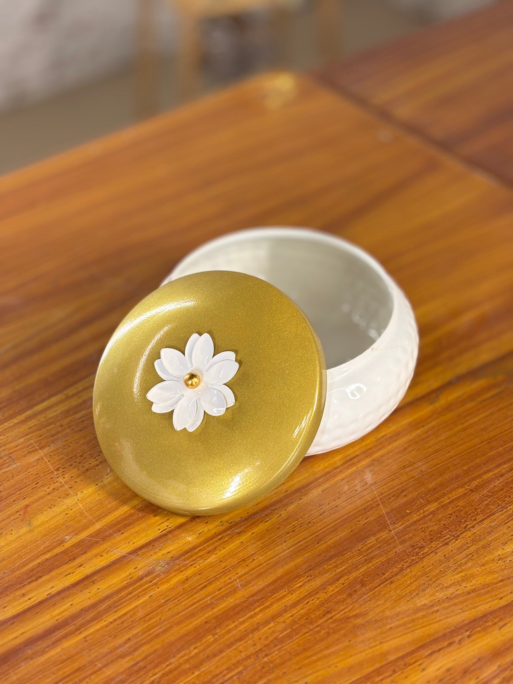 One white ceramic jar with a gold lotus motif lid (airtight and easy to reuse)