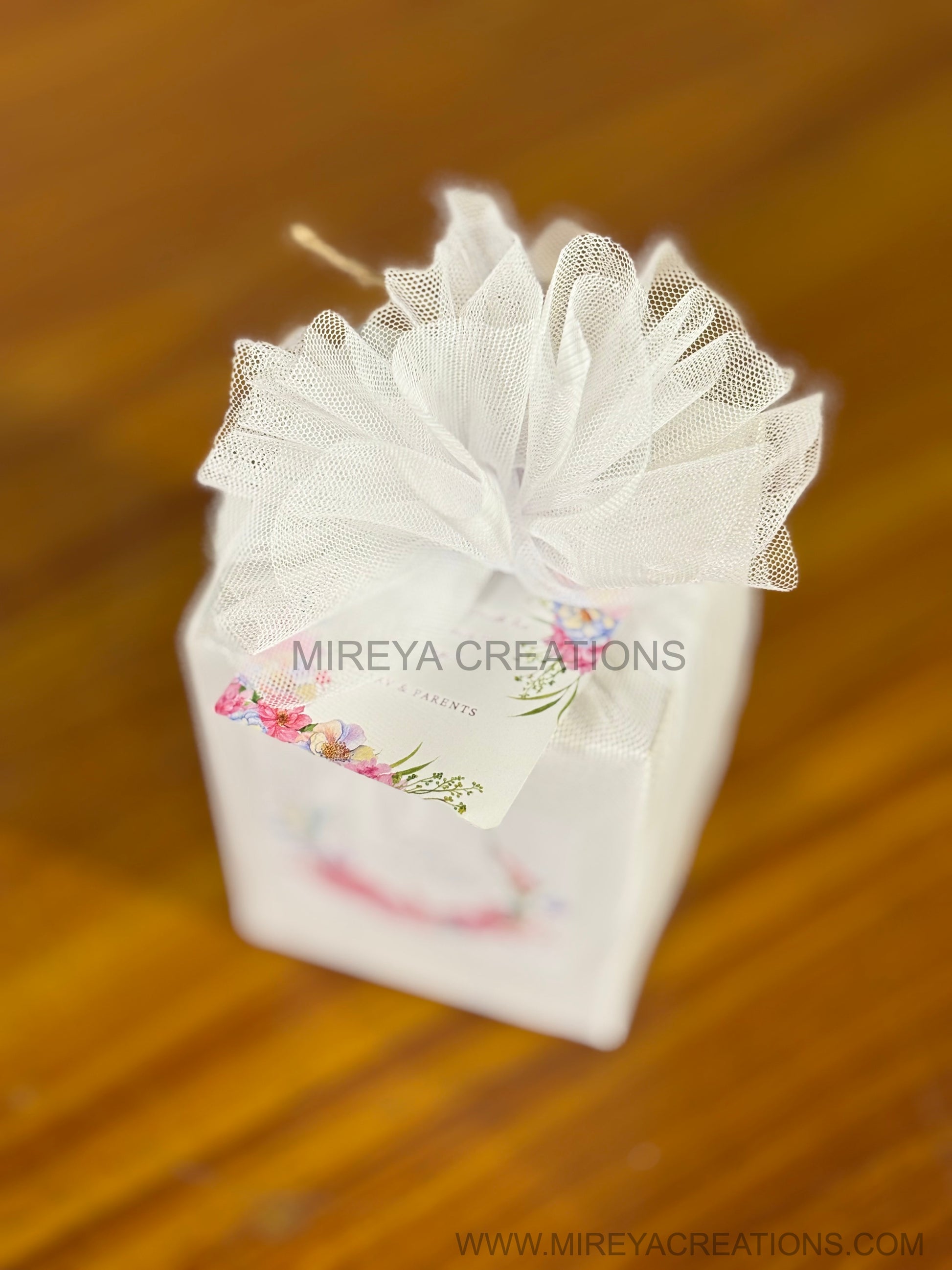 Custom themed box with wrapped in net with tag