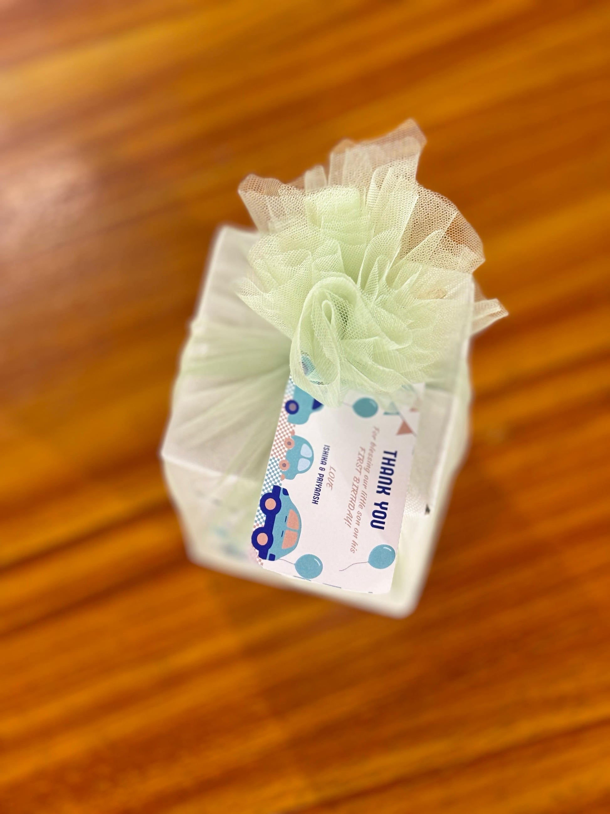 This return gift combines the joy of delicious chocolates with the charm of a keepsake jar, giving children and adults a treat they can both enjoy and remember. The variety of chocolates ensures there’s something for everyone, and the personalized packaging adds a special touch that makes your event stand out.