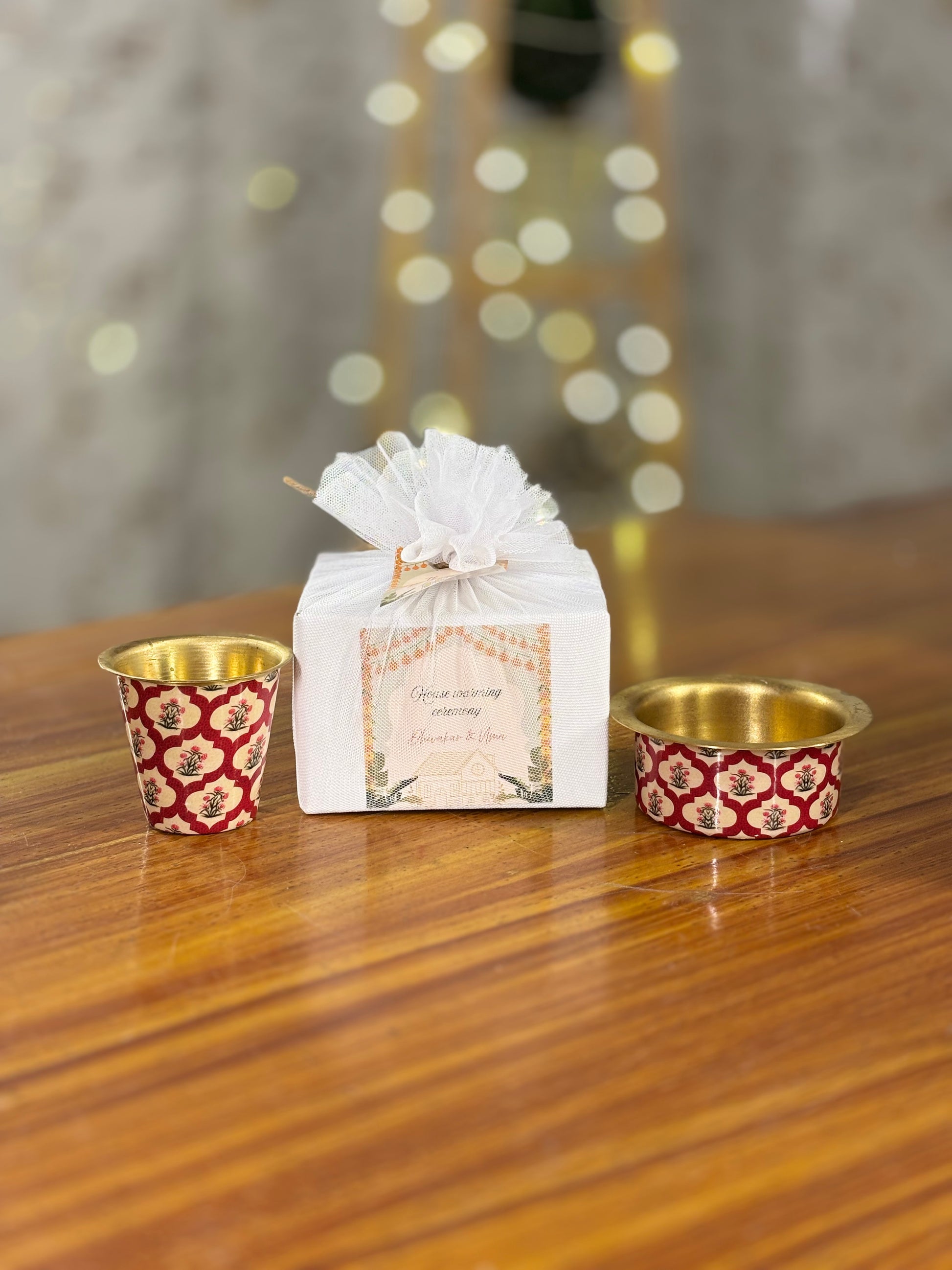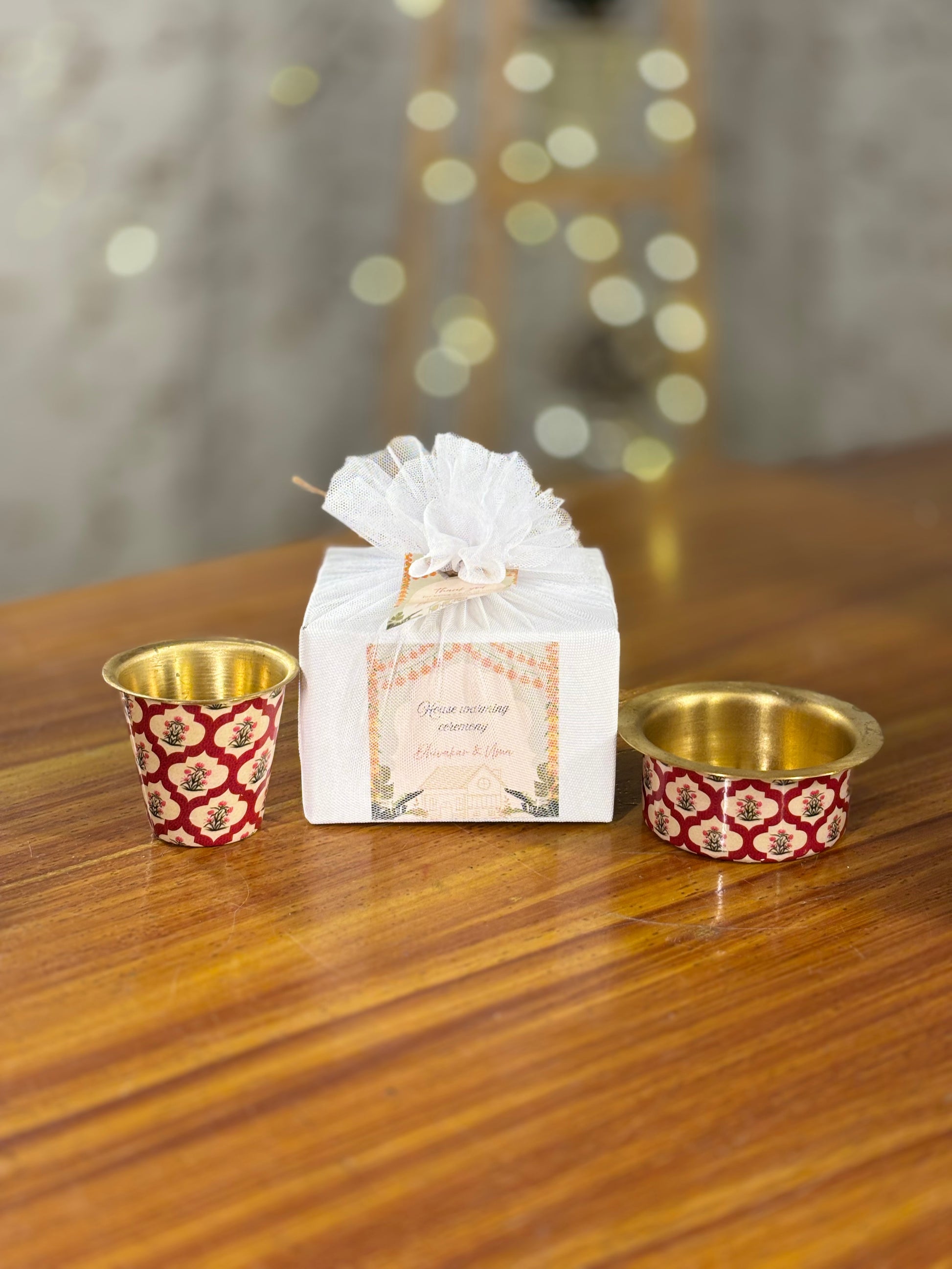 Celebrate tradition with Mireya Creations’ Red Printed Brass Tumbler & Bowl Set a classic davara set ideal for weddings, poojas, housewarmings, and milestone events. Each set features a beautifully printed brass tumbler and matching bowl, blending vintage South Indian coffee culture with artistic flair. These handcrafted pieces are food safe, durable, and finished with intricate red floral and geometric motifs. Each set comes in a coordinated net pouch with a custom tag, making them ready to gift in bulk or display at your next celebration. For hosts seeking meaningful, reusable, and elegant return gifts, this brass set is a timeless choice.