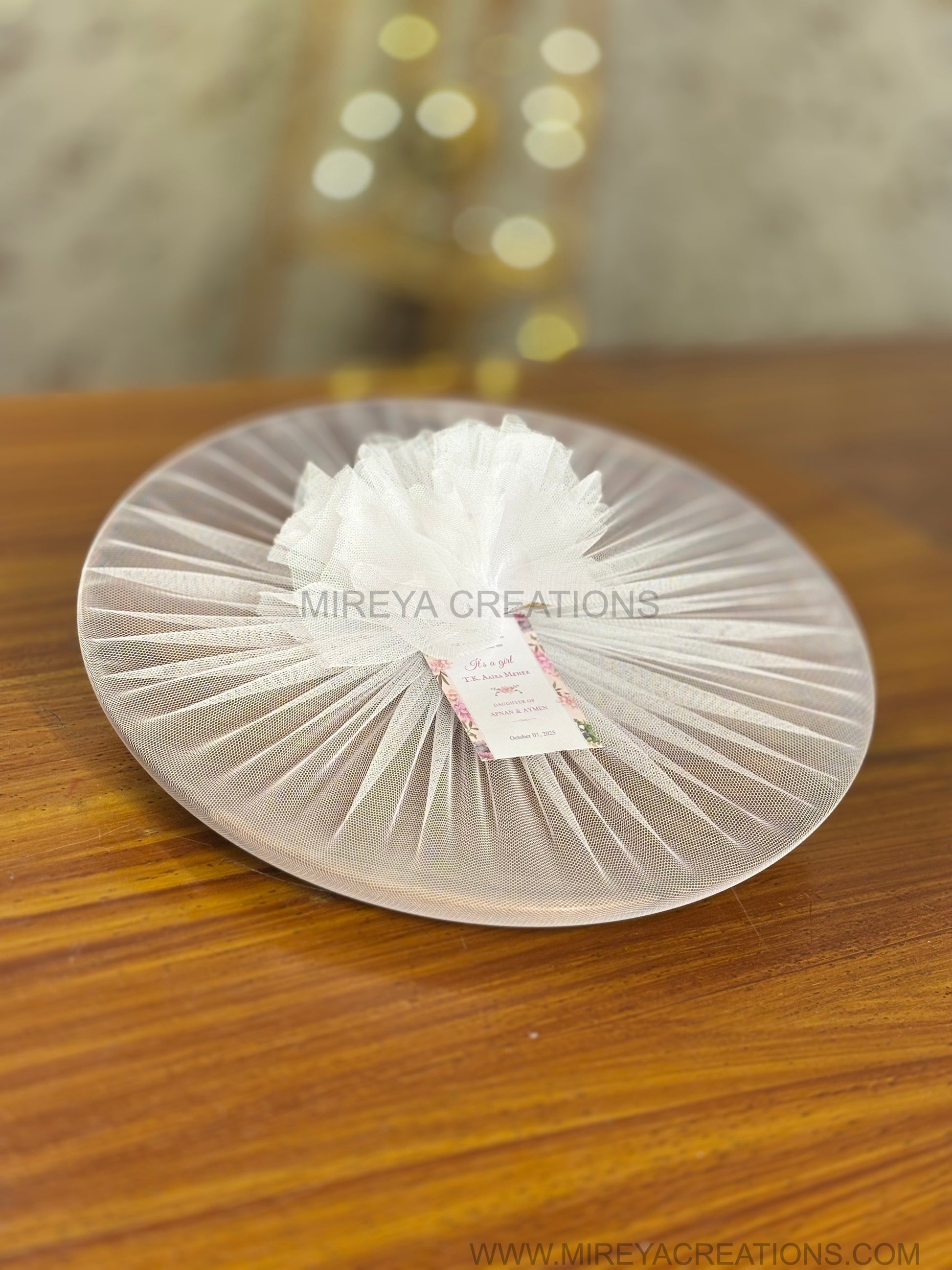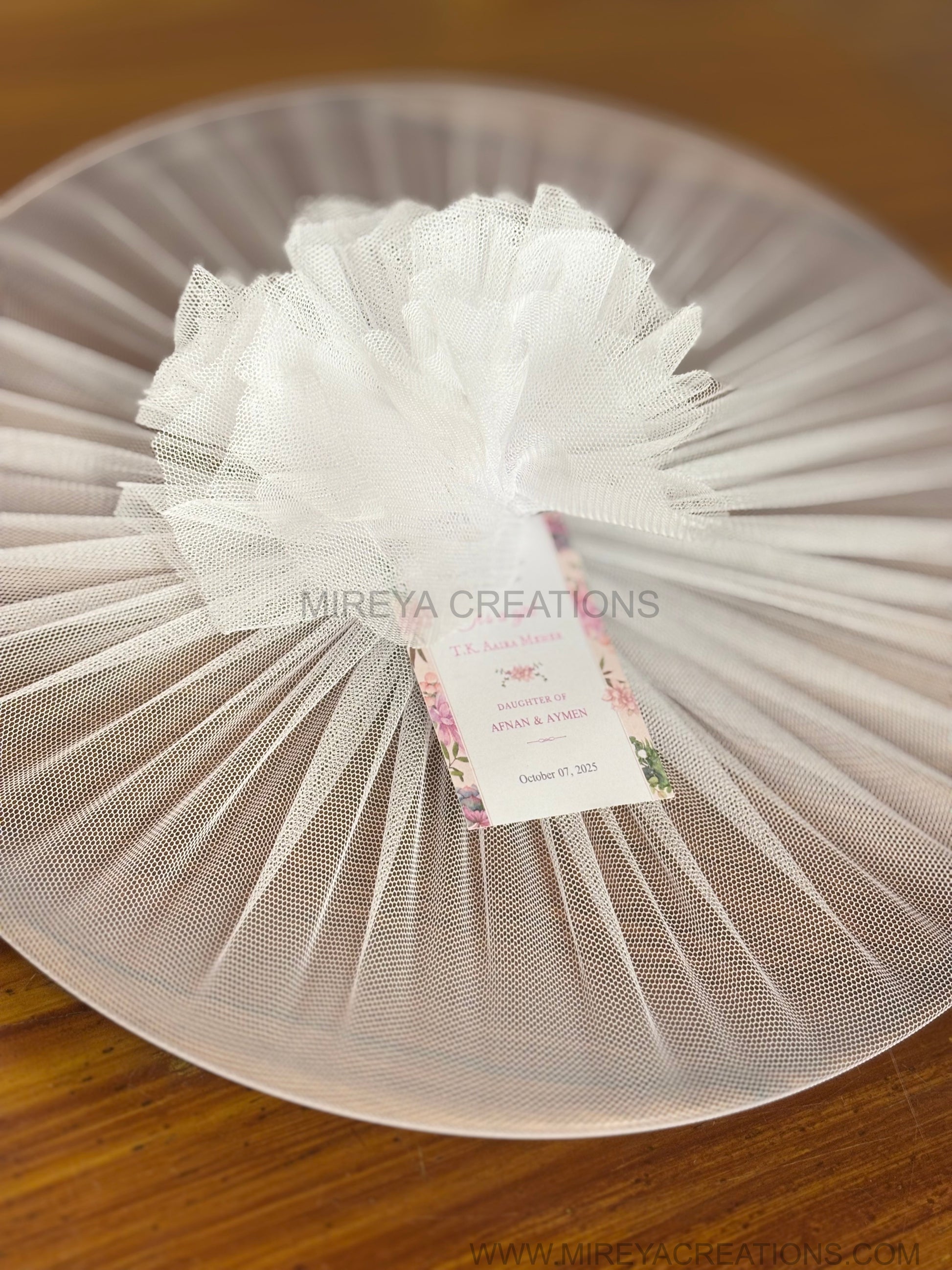 Optional net gift wrapping with bow and personalised tag